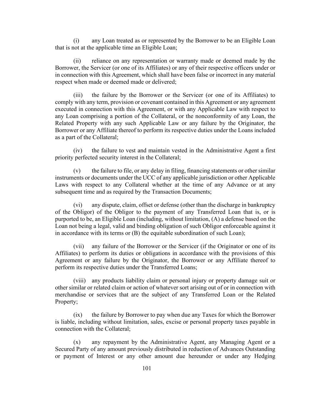 101(i)被借款人视为或代表为合资格贷款的任何贷款,但在适用时间并非合资格贷款;(ii)依赖借款人、服务人(或其关联公司之一)或其各自的任何高级人员根据本协议或与本协议有关作出或视为作出的任何陈述或保证,而该等陈述或保证在作出或视为作出或交付时在任何重要方面均属虚假或不正确;(iii)借款人或服务人(或其关联公司之一)未能遵守任何条款,本协议或与本协议有关而签立的任何协议所载的条文或契诺,或与构成抵押品一部分的任何贷款有关的任何适用法律有关的条文或契诺,或任何贷款、相关财产与任何该等适用法律不一致,或发起人、借款人或其任何关联人未能履行其在作为抵押品一部分的贷款项下各自的职责;(iv)未能归属和维持归属于行政代理人的抵押品上的第一优先权完善担保权益;(v)未能备案,或根据任何适用司法管辖区的UCC或其他适用法律就任何抵押品提交、融资报表或其他类似文书或文件的任何延迟,无论是在任何垫款时还是在任何后续时间,并按交易文件的要求;(vi)债务人就支付任何已转让贷款(即或据称是合格贷款)(包括但不限于(a)基于贷款不合法的抗辩,该等债务人根据其条款可对其强制执行的有效及具约束力的义务或(b)该等贷款的衡平法从属地位);(vii)借款人或服务人(如发起人或其关联公司之一)未能按照本协议的规定履行其职责或义务或发起人未能履行其任何义务,借款人或其任何关联机构履行其在所转让贷款项下的各自职责;(viii)任何产品责任索赔或人身伤害或财产损失诉讼或其他类似或相关的任何类型的索赔或诉讼;(ix)借款人未能在到期时支付借款人应承担的任何税款,包括但不限于与抵押品有关的销售、消费税或个人财产税;(x)行政代理人的任何还款,任何管理代理或有担保方之前因减少未偿预付款或支付利息或根据本协议或任何对冲到期的任何其他金额而分配的任何金额
