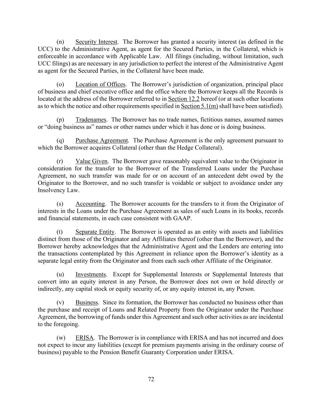 72(n)担保权益。借款人已将担保物上的担保权益(定义见UCC)授予行政代理人,作为有担保方的代理人,该担保权益可根据适用法律强制执行。在任何司法管辖区为完善作为代理人的行政代理人代表有担保方的利益所必需的所有备案(包括但不限于此类UCC备案)均已在担保物中备案。(o)办事处的地点。借款人的组织管辖权、主要营业地点和行政总裁办公室以及借款人保存所有记录的办公室位于本条例第12.2条所指的借款人的地址(或第5.1(m)条所指明的通知和其他要求应已得到满足的其他地点)。(p)商标名称。借款人没有商号、虚构名称、假名或“以”名或其他已做或正在做生意的名称。(q)购买协议。购买协议是借款人获得抵押品(对冲抵押品除外)所依据的唯一协议。(r)给予的价值。借款人作为根据购买协议向借款人转让转让所转让贷款的对价向发起人提供合理等值的价值,没有为或因发起人欠借款人的前项债务而进行此种转让,并且根据任何破产法,此种转让均不可撤销或须予撤销。(s)会计。借款人在其账簿、记录和财务报表中将购买协议项下贷款权益的发起机构向其转移的款项作为此类贷款的销售入账,在每种情况下均符合公认会计原则。(t)单独实体。借款人作为资产和负债与发起人及其任何关联公司(借款人除外)的资产和负债不同的实体运营,借款人在此承认,行政代理人和贷款人正在依据借款人作为独立于发起人的法律实体的身份以及与发起人的这类其他关联公司进行本协议所设想的交易。(u)投资。除补充权益或补充权益转换为任何人的股权外,借款人不拥有或直接或间接持有任何人的任何股本或股本证券,或任何人的任何股权。(五)业务。自成立以来,借款人除根据购买协议向发起人购买和收取贷款及相关财产、根据本协议借入资金以及前述附带的其他活动外,未开展其他业务。(w)ERISA。借款人遵守ERISA,没有发生也不会发生根据ERISA应付给养老金福利担保公司的任何负债(正常业务过程中产生的保费付款除外)。