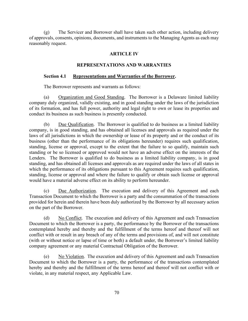 70(g)服务人和借款人应已采取各自合理要求的其他行动,包括向管理代理人交付批准、同意书、意见、文件和文书。第四条申述和保证第4.1节借款人的申述和保证。借款人的陈述和保证如下:(a)组织和良好信誉。借款人是一家特拉华州有限责任公司,正式组建、有效存续,并在其组建的司法管辖区法律下具有良好的信誉,拥有拥有或租赁其财产并按目前开展的业务开展业务的充分权力、权限和合法权利。(b)适当资格。借款人有资格作为有限责任公司开展业务,信誉良好,并已根据其财产的所有权或租赁和/或其业务的开展(履行其在本协议项下的义务除外)所要求的所有法域的法律获得所有许可和批准,除非未能获得此种资格、维持此种地位或获得此种许可或批准不会对贷款人的利益产生不利影响。借款人有资格作为有限责任公司开展业务,信誉良好,并已获得所有州法律规定的所有许可和批准,在这些州履行其根据本协议承担的义务需要此类资格、地位、许可或批准,如果未能获得资格或获得此类许可或批准将对其根据本协议履行的能力产生重大不利影响。(c)适当授权。本协议和借款人作为一方当事人的每份交易文件的执行和交付以及本协议和本协议中规定的交易的完成均已通过借款人方面的一切必要行动得到借款人的正式授权。(d)没有冲突。本协议及借款人作为一方当事人的每份交易文件的签署和交付、借款人履行本协议及由此设想的交易以及履行本协议及其中的条款将不会与借款人的有限责任公司协议或借款人的任何重大合同义务相冲突或导致违反任何条款和规定,也不会构成(无论是否通知或时间流逝或两者兼而有之)借款人的有限责任公司协议或借款人的任何重大合同义务项下的违约。(e)没有违反。本协议及借款人作为一方当事人的每份交易文件的执行和交付、本协议及由此设想的交易的履行以及本协议及其条款的履行,在任何重大方面均不会与任何适用法律发生冲突或违反。