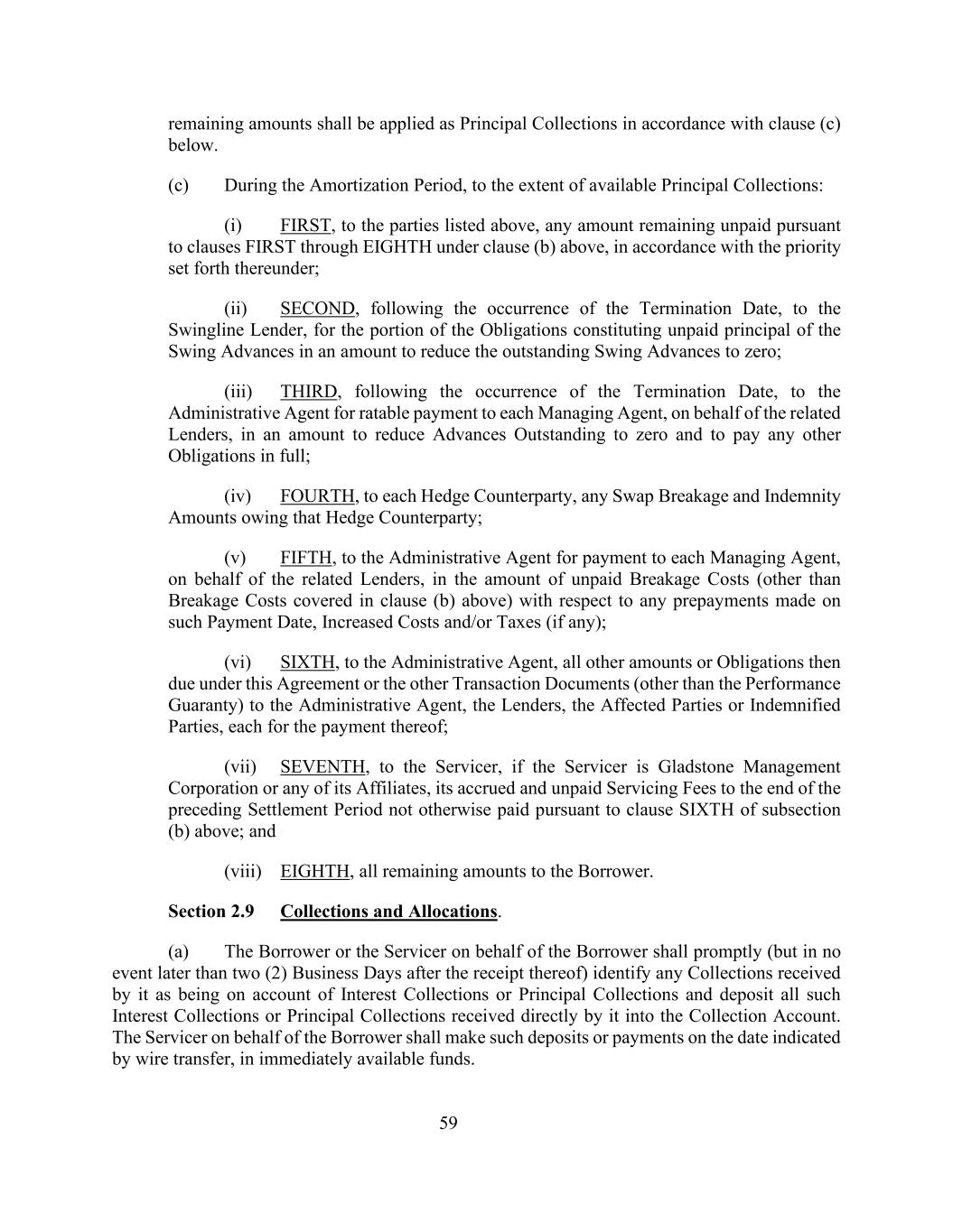 59项余下款项须根据下文(c)条作为本金征收。(c)在摊销期内,以可用本金收款为限:(i)首先,向上述各方,根据上文(b)条规定的第FIRST至第8条,按照其中规定的优先权,支付任何未付款项;(ii)第二,在终止日期发生后,向Swingline贷款人,支付构成周转垫款未付本金的债务部分,金额将未付周转垫款减至零;(iii)第三,在终止日期发生后,向行政代理人按比例向各管理代理人支付款项,代表相关贷款人,金额为将未偿预付款减少至零并全额支付任何其他义务;(iv)第四次,向每一对冲交易对手支付欠该对冲交易对手的任何掉期违约和赔偿金额;(v)第五次,向行政代理人支付代表相关贷款人向每一管理代理人支付的与在该付款日期支付的任何预付款、增加的成本和/或税款(如有)有关的未付违约金(上文(b)条所涵盖的违约金除外)的金额;(vi)第六次,向行政代理人,当时根据本协议或其他交易文件(履约保函除外)应支付给行政代理人、贷款人、受影响各方或受赔偿各方的所有其他金额或义务,每一方均须支付;(vii)第七,向服务商,如果服务商是Gladstone Management Corporation或其任何关联公司,其截至上一个结算期结束时的应计和未支付的服务费未根据上述(b)款第6款以其他方式支付;以及(viii)第八,所有剩余金额为借款人。第2.9节收款和拨款。(a)借款人或代表借款人的服务人应迅速(但在任何情况下不得迟于收到后的两(2)个营业日)将其收到的任何收款识别为利息收款或本金收款,并将其直接收到的所有该等利息收款或本金收款存入收款账户。代表借款人的服务人应在电汇显示的日期以即时可用资金进行此类存款或付款。