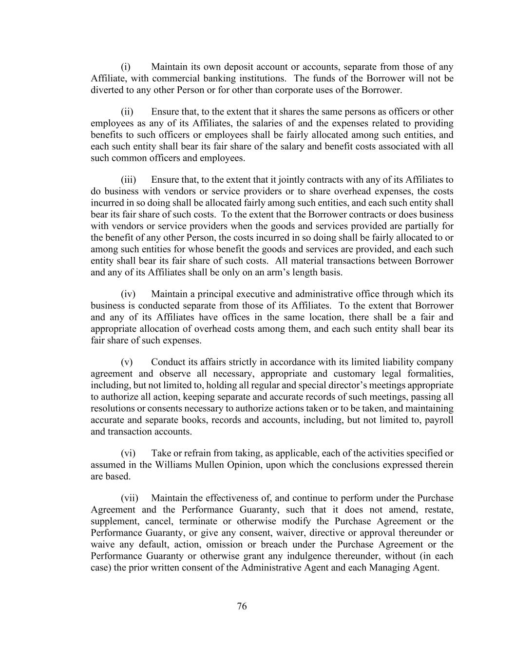 76(i)与商业银行机构保持自己的一个或多个存款账户,与任何关联机构的账户分开。借款人的资金不会转用于任何其他人,也不会用于借款人的公司以外用途。(二)确保在与其任何附属公司共享与高级职员或其他雇员相同的人员的范围内,向这些高级职员或雇员提供福利的工资和相关费用应在这些实体之间公平分配,并且每个此类实体应承担其与所有这些共同高级职员和雇员相关的工资和福利费用的公平份额。(iii)确保在其与任何关联公司共同签订合同以与供应商或服务提供商开展业务或分摊间接费用的范围内,这样做所产生的成本应在这些实体之间公平分配,并且每个此类实体应承担其公平分担的此类成本。如果借款人在所提供的货物和服务部分为任何其他人的利益时与供应商或服务提供者订立合同或开展业务,则这样做所产生的费用应公平分配给为其利益提供货物和服务的这些实体或在这些实体之间公平分配,并且每个此类实体应承担其公平分担的此类费用。借款人与其任何关联公司之间的所有重大交易应仅在公平基础上进行。(iv)维持一个主要行政和行政办公室,通过该办公室,其业务与其附属公司的业务分开进行。在借款人及其任何关联机构在同一地点设有办事处的范围内,应公平、适当地在它们之间分配间接费用,并且每个此类实体应承担其公平分担的此类费用。(v)严格按照其有限责任公司协议处理其事务,并遵守所有必要、适当和惯常的法律手续,包括但不限于举行所有适当的定期和特别董事会议以授权所有行动,保存此类会议的单独和准确记录,通过所有必要的决议或同意以授权已采取或将采取的行动,并保持准确和单独的账簿、记录和账目,包括但不限于工资和交易账户。(vi)酌情采取或不采取威廉姆斯 Mullen意见中指明或承担的每一项活动,其中所述结论所依据的是该意见。(vii)维持购买协议及履约保证的有效性并继续履行,以使其不修订、重述、补充、取消、终止或以其他方式修改购买协议或履约保证,或根据该协议给予任何同意、放弃、指示或批准,或放弃购买协议或履约保证项下的任何失责、作为、不作为或违约,或以其他方式授予根据该协议作出的任何宽免,而无须(在每宗个案中)行政代理人及各管理代理人的事先书面同意。