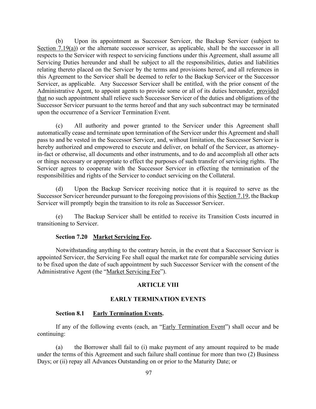 97(b)在获委任为继任服务人员后,后备服务人员(在符合第7.19(a)节的规定下)或候补继任服务人员(如适用)应在本协议项下的服务职能方面成为该服务人员的所有方面的继任者,应承担本协议项下的所有服务职责,并应受本协议条款和规定赋予该服务人员的与此相关的所有责任、义务和责任的约束,本协议中对该服务人员的所有提及均应被视为提及后备服务人员或适用的继任服务人员。任何继任服务人在征得行政代理人事先同意后,有权委任代理人提供其在本协议项下的部分或全部职责,但此种委任不得解除该继任服务人根据本协议条款承担的继任服务人的职责和义务,且任何该等分包合同可在发生服务人终止事件时终止。(c)根据本协议授予服务人的所有权力和权力应在服务人根据本协议终止时自动终止和终止,并应传递给继任服务人并归属于继任服务人。并且,不限于,兹授权继任服务人代表服务人以事实上或其他方面的代理人的身份执行和交付所有文件和其他文书,并作出和完成所有其他必要或适当的行为或事情,以实现此类服务权转让的目的。服务人同意与继任服务人合作,以实现服务人在抵押品上进行服务的责任和权利的终止。(d)备份服务商收到通知,根据本条第7.19条的上述规定要求其担任本协议项下的继任服务商后,备份服务商将立即开始过渡到其作为继任服务商的角色。(e)备份服务商应有权收取其在过渡到服务商时产生的过渡费用。第7.20款市场服务费。尽管本文有任何相反的规定,在继任服务人被任命为服务人的情况下,服务费应等于该继任服务人经行政代理人同意在该任命之日确定的可比服务税的市场费率(“市场服务费”)。第八条提前终止事件第8.1节提前终止事件。如发生以下任何事件(每一事件均称为“提前终止事件”)且仍在继续:(a)借款人应未能(i)支付根据本协议条款要求支付的任何金额,且该未能支付应持续超过两(2)个工作日;或(ii)在到期日或之前偿还所有未偿还的垫款;或