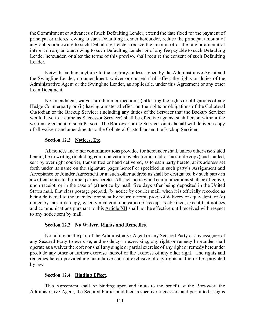 111该等违约贷款人的承诺或垫款,延长根据本协议支付该违约贷款人的本金或利息的固定日期,减少欠该违约贷款人的任何债务的本金金额,减少欠该违约贷款人的任何金额的利息金额或利率或金额,或根据本协议应支付给该违约贷款人的任何费用,或更改本但书的条款,均须经该违约贷款人同意。尽管有任何相反的规定,除非经行政代理人与Swingline贷款人签署,否则任何修订、放弃或同意均不影响行政代理人或Swingline贷款人(如适用)在本协议或任何其他贷款文件下的权利或义务。任何修订、放弃或其他修改(i)影响任何对冲交易对手的权利或义务,或(ii)对抵押品托管人或备用服务商的权利或义务(包括备用服务商作为继任服务商必须承担的任何义务)均不得在未经该人书面同意的情况下对该人具有效力。借款人或代其提供服务者将向抵押品托管人和备用服务者交付一份所有豁免和修改的副本。第12.2节通知等。除本协议另有规定外,本协议项下规定的所有通知和其他通信均应以书面形式(包括以电子邮件或传真副本进行的通信),并就本协议每一方而言,按本协议签字页上其名下所列地址或该方转让和接受或共同协议中指明的地址或按该方在给本协议其他方的书面通知中指定的其他地址邮寄、隔夜快递、传送或专人递送。所有这类通知和通信均应在收到时生效,或在(a)邮寄通知的情况下,自寄存美国邮件五天后,预付一等邮资,(b)快递邮件通知,当正式记录为以回执、交付证明或同等证明的方式交付给预定收件人时,或(c)以传真复印的通知,当获得口头收到通知时,但根据本条第十二条发出的通知和通信在收到任何邮寄通知之前不生效。第12.3节没有放弃、权利和补救。行政代理人或任何有担保方或任何有担保方的任何受让人未行使、也未迟延行使本协议项下的任何权利或补救办法,均应作为对其放弃而运作;也不应因单独或部分行使本协议项下的任何权利或补救办法而排除任何其他或进一步行使该权利或行使任何其他权利。此处提供的权利和补救措施是累积的,不排除法律规定的任何权利和补救措施。第12.4节约束效力。本协议对借款人、行政代理人、有担保当事人及其各自的继承人和许可受让人具有约束力,并符合其利益