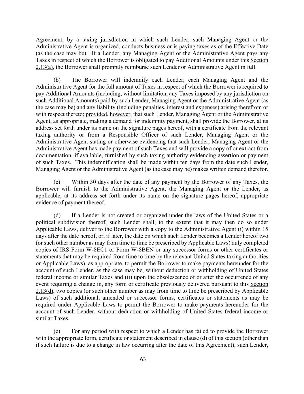 63协议,由该等贷款人、该管理代理人或该行政代理人组织、开展业务或截至生效日期(视情况而定)正在缴纳税款的税务管辖区。如果贷款人、任何管理代理人或行政代理人支付了借款人根据本条第2.13(a)款有义务支付额外金额的任何税款,借款人应立即全额偿还该贷款人或行政代理人。(b)借款人将就借款人须就该贷款人、管理代理人或行政代理人(视属何情况而定)支付的额外金额(包括但不限于任何司法管辖区就该等额外金额征收的任何税款)及由此产生或与此有关的任何法律责任(包括罚款、利息及开支),向每名贷款人、每名管理代理人或行政代理人(视情况而定)作出要求支付弥偿款项的全部税款,向借款人作出赔偿,在本协议签字页上其名下所列的地址,附有相关税务机关或该贷款人、管理代理人或行政代理人的负责人员出具的证明,说明或以其他方式证明该贷款人、管理代理人或行政代理人已缴纳该等税款,并将提供该税务机关提供的证明主张或缴纳该等税款的文件副本或文件摘录(如有)。本次赔偿应当自该贷款人、经管代理人或者行政代理人(视情况而定)提出书面要求之日起十日内作出。(c)在借款人缴付任何税款的日期后30天内,借款人将向行政代理人、管理代理人或贷款人(如适用)在其在本协议签字页上其名下所列的地址提供有关付款的适当证据。(d)如果贷款人不是根据美国法律或其政治分支机构设立或组织的,则该贷款人应在其根据适用法律可能这样做的范围内,在本协议日期后15天内向借款人交付一份副本给行政代理人(i),或者,如果更晚,该贷款人成为本协议贷款人的日期(或适用法律可能不时订明的其他数目)已妥为填妥的IRS表格W-8EC1或表格W-8BEN或美国相关税务当局或适用法律可能不时要求的任何继承表格或其他证明或报表的副本),以酌情允许借款人根据本协议为该贷款人的账户(视情况而定)支付款项,不扣除或扣留美国联邦收入或类似税款,以及(ii)在任何需要更改的事件发生时或之后,根据本条2.13(d)、两份(或适用法律可能不时订明的其他号码)适用法律可能要求的附加、经修订或继承的表格、证书或报表的副本(或适用法律可能不时订明的其他号码),以允许借款人根据本协议为该贷款人的账户付款,不扣除或预扣美国联邦收入或类似税收。(e)就贷款人未能就任何期间向借款人提供本条(d)款所述的适当表格、证书或声明(除非该等未能提供是由于在本协议日期后发生的法律变更)而言,该贷款人,