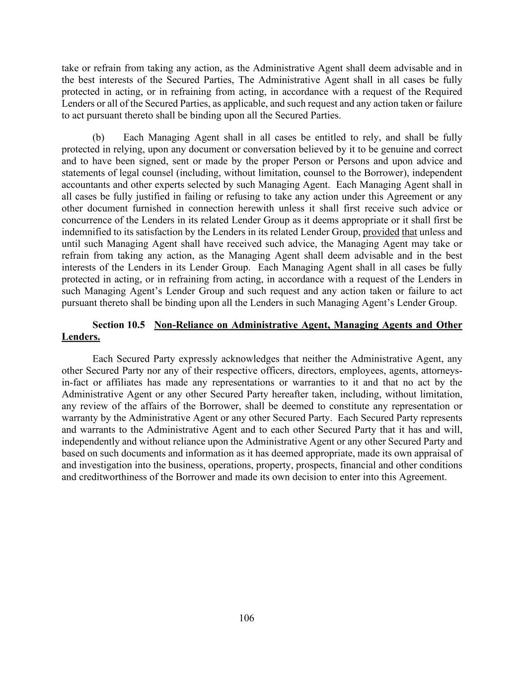 106采取或不采取任何行动,因为行政代理人应认为是可取的,并且符合有担保当事人的最佳利益,在任何情况下,行政代理人都应在根据所需贷款人或所有有担保当事人的请求(如适用)采取行动或不采取行动方面得到充分保护,而这种请求以及根据该请求采取或不采取行动应对所有有担保当事人具有约束力。(b)每名管理代理人在任何情况下均有权依赖其认为真实和正确的任何文件或谈话,并在依赖该文件或谈话时受到充分保护,该文件或谈话已由适当的人或个人签署、发送或作出,并根据法律顾问(包括但不限于借款人的大律师)、独立会计师和该管理代理人选定的其他专家的建议和陈述。各管理代理人在任何情况下均应有充分理由不采取或拒绝根据本协议或与本协议有关的任何其他文件采取任何行动,除非其应首先收到其认为适当的其相关贷款集团中的贷款人的建议或同意,或其应首先得到其相关贷款集团中的贷款人满意的赔偿,但除非且直至该管理代理人收到该等建议,管理代理人可采取或不采取任何行动,作为管理代理人应认为可取且符合其贷款人集团中贷款人的最佳利益。在任何情况下,每一管理代理人均应在根据该管理代理人的贷款人集团中的贷款人的请求行事或不行事方面受到充分保护,而该请求以及根据该请求采取或不采取行动的任何行动均应对该管理代理人的贷款人集团中的所有贷款人具有约束力。第10.5节不依赖行政代理、经办代理和其他出借人。各有担保方明确承认,行政代理人、任何其他有担保方或其各自的任何高级职员、董事、雇员、代理人、事实上的律师或关联机构均未向其作出任何陈述或保证,且行政代理人或任何其他有担保方此后采取的任何行为,包括但不限于对借款人事务的任何审查,均不应被视为构成行政代理人或任何其他有担保方的任何陈述或保证。每一有担保方向行政代理人和相互担保方声明并保证,其已经并将独立且不依赖行政代理人或任何其他有担保方,并基于其认为适当的文件和信息,对借款人的业务、经营、财产、前景、财务和其他条件及信誉作出自己的评估和调查,并自行作出订立本协议的决定。