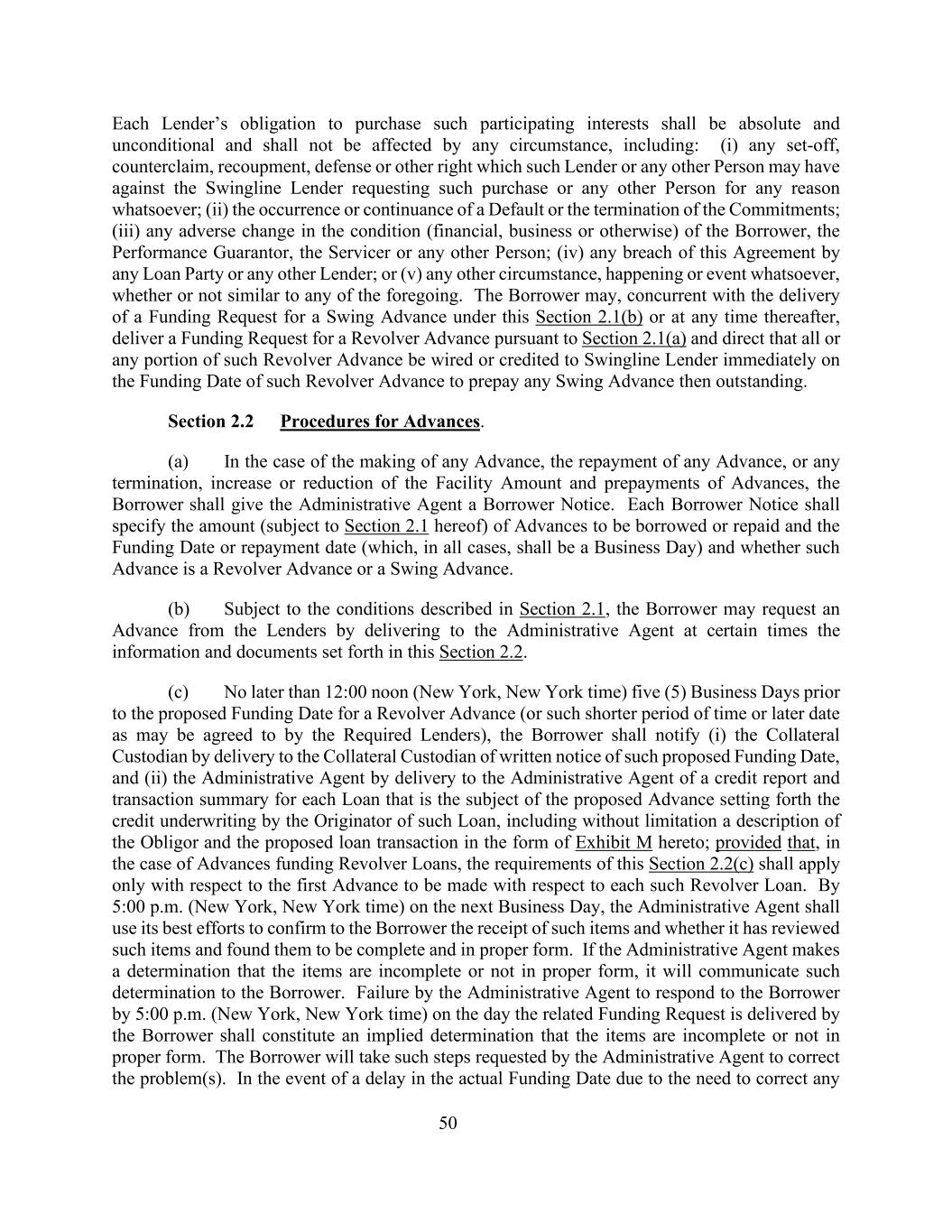 50每个贷款人购买此类参与权益的义务应是绝对和无条件的,不受任何情况的影响,包括:(i)该贷款人或任何其他人因任何原因对要求此类购买的Swingline贷款人或任何其他人可能拥有的任何抵销、反索赔、补偿、抗辩或其他权利;(ii)违约的发生或持续或承诺的终止;(iii)借款人、履约担保人的状况(财务、业务或其他方面)的任何不利变化,服务人或任何其他人;(iv)任何贷款方或任何其他贷款人违反本协议;或(v)任何其他情况、发生或事件,不论是否与上述任何情况相似。借款人可在根据本条第2.1(b)款交付周转预付款的资金请求的同时,或在其后的任何时间,根据第2.1(a)款交付周转预付款的资金请求,并指示在此种循环预付款的资金提供日期立即将此种循环预付款的全部或任何部分电汇或贷记给周转贷款人,以预付当时未偿还的任何周转预付款。第2.2节预付款程序。(a)在作出任何垫款、偿还任何垫款或终止、增加或减少融资额度及预付款项的情况下,借款人应向行政代理人发出借款人通知。每份借款人通知应指明将借入或偿还的垫款金额(以本协议第2.1节为准)和资金提供日期或偿还日期(在所有情况下均应为营业日),以及此种垫款是循环垫款还是周转垫款。(b)在符合第2.1节所述条件的情况下,借款人可通过在某些时间向行政代理人交付本条第2.2节所列资料和文件,请求贷款人提供预付款。(c)不迟于循环垫款的拟议筹资日期(或所需贷款人可能同意的较短期限或较后日期)前五(5)个工作日的中午12:00(纽约、纽约时间),借款人应将该拟议筹资日期的书面通知送达抵押托管人,通知(i)抵押托管人,(ii)行政代理人通过向行政代理人交付每笔作为拟议垫款标的的贷款的信用报告和交易摘要,其中载明由该贷款的发起人进行的信贷承销,包括但不限于对债务人的描述以及以本协议的附件 M形式进行的拟议贷款交易;但在为Revolver贷款提供资金的垫款的情况下,本条第2.2(c)款的要求仅适用于就每笔该等Revolver贷款进行的第一笔垫款。行政代理人应在下一个营业日下午5:00(纽约、纽约时间)前,尽最大努力向借款人确认收到该等物品,以及是否审查过该等物品并认为其完整、形式适当。如果行政代理人作出物品不完整或形式不适当的认定,就会将这种认定告知借款人。行政代理人未能在借款人交付相关资金请求之日下午5:00(纽约、纽约时间)前对借款人作出答复,应构成默示确定物品不完整或形式不适当。借款人将采取行政代理人要求的此类步骤来纠正问题。如果由于需要更正任何