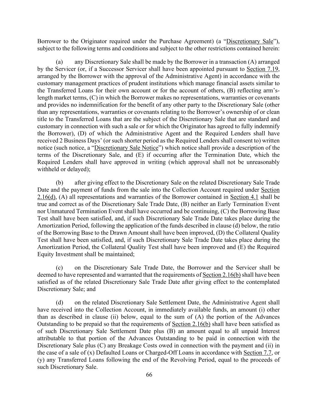 66购买协议要求的发起人的借款人)(“全权出售”),但须遵守以下条款和条件,并受本协议所载的其他限制:(a)任何全权出售应由借款人在由服务人安排的交易(a)中(或者,如果已根据第7.19条指定继任服务人,则由借款人在行政代理人批准下安排)按照审慎机构的惯常管理做法进行,这些机构为自己或他人的账户管理与所转让贷款类似的金融资产,(b)反映公平的市场条款,(c)借款人没有作出任何陈述、保证或契诺,也没有为酌情出售的任何其他方的利益提供任何赔偿(但与借款人对作为酌情出售标的的转让贷款的所有权或清洁所有权有关的任何陈述、保证或契诺除外,这些陈述、保证或契诺是与此种出售有关的标准和惯例,或发起人已同意为此向借款人提供全额赔偿),(d)其中行政代理人及规定贷款人须已收到2个营业日的书面通知(或规定贷款人同意的较短期限)(该通知、“酌情出售通知”),该通知须提供有关酌情出售条款的说明,及(e)如发生在终止日期后,规定贷款人应已书面批准(该批准不得无理扣留或延迟);(b)在有关的酌情出售交易日期生效及根据第2.16(d)条规定将出售所得款项支付至收款账户后,(a)第4.1节所载的借款人的所有陈述和保证自该酌情出售交易日期起均属真实和正确,(b)提前终止事件或未到期终止事件均不应发生且仍在继续,(c)借款基础测试应已满足,并且,如果该全权出售交易日发生在摊销期内,则在应用下文(d)款所述资金后,借款基数与提取金额的比率应已得到改善,(d)抵押品质量测试应已满足,如果该全权出售交易日发生在摊销期内,则抵押品质量测试应已得到改善,并且(e)应保持所要求的股权投资;(c)在全权出售交易日,借款人和服务人应被视为已声明并保证,在预期的全权出售生效后,第2.16(b)条的要求应已在相关的全权出售交易日期得到满足;及(d)在相关的全权出售结算日,行政代理人应已以即时可用的资金向收款账户收取下文第(ii)款所述以外的金额(i),等于(a)截至该酌情出售结算日已满足第2.16(b)条规定的未偿还垫款部分的总和,加上(b)相当于与该酌情出售有关的未偿还垫款部分应支付的所有未付利息加上(c)与付款有关的任何违约费用,以及(ii)在根据第7.7条出售(x)违约贷款或已核销贷款的情况下,或(y)循环期结束后的任何转让贷款,相当于此类全权出售的收益。