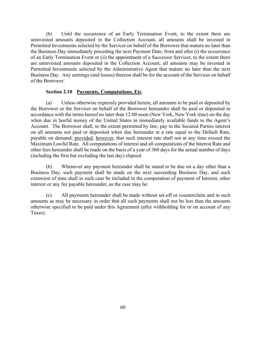 60(b)在发生提前终止事件之前,只要收款账户中存有未投资金额,所有金额均应投资于服务商代表借款人选定的不迟于紧接下一个付款日期前一个营业日到期的许可投资;自(i)发生提前终止事件或(ii)任命继任服务商起及之后,只要收款账户中存有未投资金额,所有金额可投资于行政代理人选定的不迟于下一个工作日到期的许可投资。其上的任何收益(和损失)应由服务人代表借款人承担。第2.10节付款、计算等(a)除非本协议另有明确规定,借款人或服务人根据本协议代表借款人支付或存入的所有金额应在不迟于美国合法资金到期之日中午12:00(纽约、纽约时间)以即时可用资金支付或存入代理人账户时按照本协议的条款支付或存入。借款人应在法律允许的范围内,以等于违约率的利率向有担保方支付本协议项下到期时未支付或存入的所有金额的利息,应按要求支付;但该利率不得在任何时候超过最高法定利率。本协议项下的所有利息计算和利率及其他费用的计算,均按一年360天的实际经过天数(含第一天但不含最后一天)计算。(b)凡根据本协议作出的任何付款须声明在营业日以外的日期到期,则该等付款须在下一个营业日支付,而在该情况下,该延长时间须包括在根据本协议须支付的利息、其他利息或任何费用(视属何情况而定)的计算中。(c)根据本协议支付的所有款项均应在没有抵销或反诉的情况下以可能需要的数额支付,以使所有这些款项不低于根据本协议另有规定应支付的数额(在扣缴任何税款或因任何税款而扣缴后)。