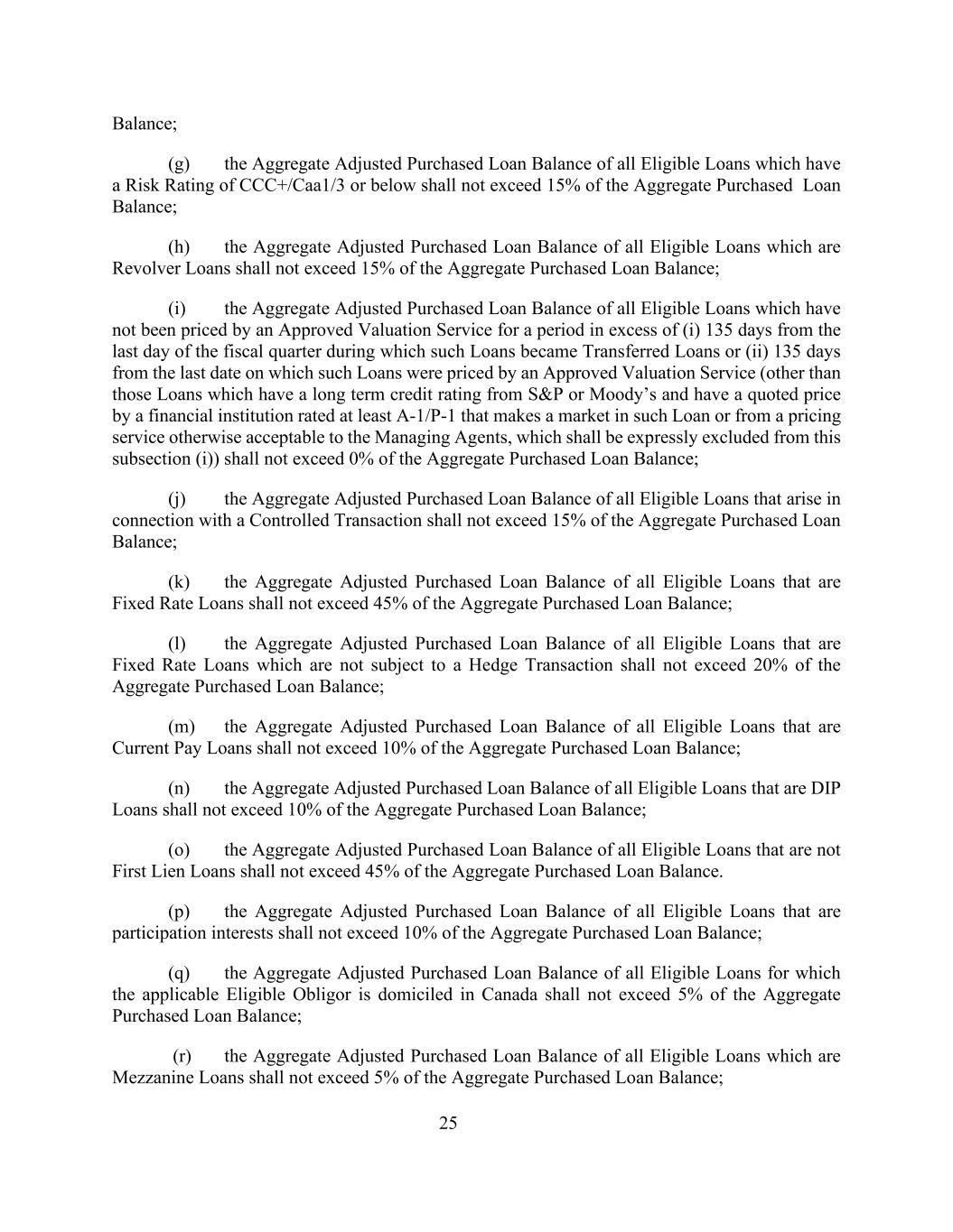 25余额;(g)风险评级为CCC +/Caa1/3或以下的所有合格贷款的调整后购买贷款余额总额不得超过购买贷款余额总额的15%;(h)属于循环贷款的所有合格贷款的调整后购买贷款余额总额不得超过购买贷款余额总额的15%;(i)所有未通过认可估值服务定价的合格贷款的调整后购买贷款余额总额超过(i)自该等贷款成为转让贷款的财政季度的最后一天起135天或(ii)自该等贷款由认可估值服务定价的最后日期起135天的期间(不包括具有标普或穆迪的长期信用评级且由在该等贷款中做市的至少评级为A-1/P-1的金融机构报价的贷款或来自管理代理以其他方式可接受的定价服务的贷款,明确排除在本款(i)项之外的贷款,不得超过购买贷款总额的0%;(j)与受控交易有关的所有合格贷款的调整后购买贷款总额不得超过购买贷款总额的15%;(k)属于固定利率贷款的所有合格贷款的调整后购买贷款总额不得超过购买贷款总额的45%;(l)所有合格贷款的调整后购买贷款总额不受套期交易约束的固定利率贷款,不得超过总购买贷款余额的20%;(m)所有符合条件的、属于当期支付贷款的贷款的调整后总购买贷款余额不得超过总购买贷款余额的10%;(n)所有符合条件的、属于DIP贷款的贷款的调整后总购买贷款余额不得超过总购买贷款余额的10%;(o)所有符合条件的贷款的调整后总购买贷款余额不属于第一留置权贷款的,不得超过所购贷款余额总额的45%。(p)属于参与权益的所有合格贷款的调整后购买贷款余额总额不得超过购买贷款余额总额的10%;(q)适用的合格义务人在加拿大注册的所有合格贷款的调整后购买贷款余额总额不得超过购买贷款余额总额的5%;(r)属于夹层贷款的所有合格贷款的调整后购买贷款余额总额不得超过购买贷款余额总额的5%;