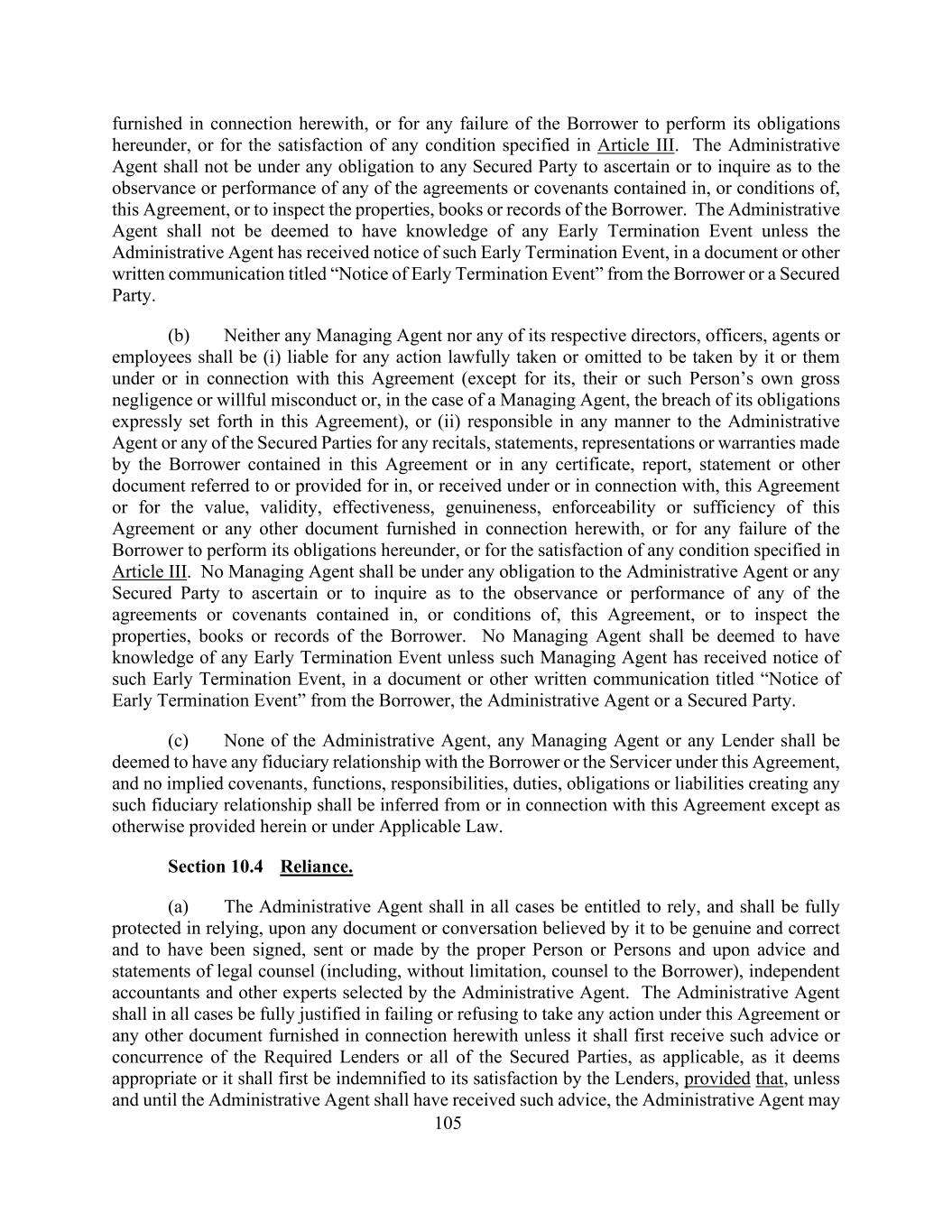 105与此有关,或因借款人未能履行其在此项下的义务,或为满足第三条规定的任何条件而提供。行政代理人不对任何有担保方承担任何义务,以查明或查询本协议所载任何协议或契诺的遵守或履行情况或本协议的条件,或检查借款人的财产、簿册或记录。除非行政代理人已收到借款人或担保方以“提前终止事件通知”为标题的文件或其他书面函件,否则不得视为行政代理人知悉任何提前终止事件。(b)任何管理代理人或其各自的任何董事、高级人员、代理人或雇员均不得(i)对其或他们根据本协议或与本协议有关而合法采取或不采取的任何行动(除非其、其或该人本身的重大过失或故意不当行为,或在管理代理人的情况下,违反其在本协议中明确规定的义务)承担责任,或(ii)以任何方式对行政代理人或任何有担保当事人承担任何陈述、陈述的责任,借款人在本协议或本协议中提及或规定的、或根据本协议收到的或与本协议有关的任何证书、报告、声明或其他文件中作出的陈述或保证,或对本协议或与本协议有关的任何其他文件的价值、有效性、有效性、真实性、可执行性或充分性作出的陈述或保证,或对借款人未能履行其在本协议下的义务作出的陈述或保证,或对满足第三条规定的任何条件作出的陈述或保证。管理代理人不得对行政代理人或任何有担保方承担任何义务,以查明或查询本协议所载任何协议或契诺的遵守或履行情况或本协议的条件,或检查借款人的财产、簿册或记录。任何管理代理人不得被视为知悉任何提前终止事件,除非该管理代理人已收到借款人、行政代理人或担保方以“提前终止事件通知”为标题的文件或其他书面通信。(c)行政代理人、任何管理代理人或任何贷款人均不得被视为与本协议项下的借款人或服务人有任何信托关系,除本协议或适用法律另有规定外,不得从本协议中推断或与本协议相关推断产生任何此类信托关系的任何默示契诺、职能、责任、义务、义务或责任。第10.4节依赖。(a)行政代理人在任何情况下均有权依赖其认为真实和正确的任何文件或谈话,并在依赖方面得到充分保护,这些文件或谈话已由适当的人或个人签署、发送或作出,并根据法律顾问(包括但不限于借款人的大律师)、独立会计师和行政代理人选定的其他专家的建议和陈述。行政代理人在任何情况下均应有充分理由不采取或拒绝根据本协议或与本协议有关的任何其他文件采取任何行动,除非其应首先收到其认为适当的所需出借人或适用的所有有担保当事人的建议或同意,或应首先得到出借人令其满意的赔偿,但除非且直至行政代理人收到该等建议,行政代理人可