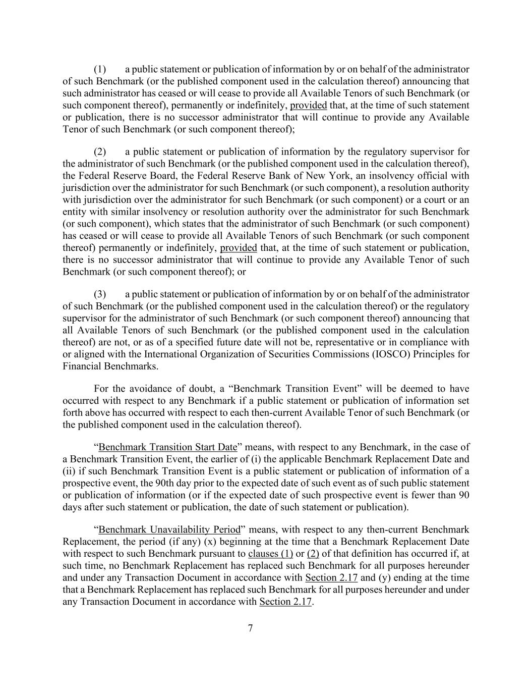 7(1)由或代表该基准的管理人(或其计算所使用的已公布部分)发表的公开声明或公布信息,宣布该管理人已永久或无限期停止提供该基准(或其此类部分)的所有可用期限,但在该声明或公布时,没有继任管理人将继续提供此类基准(或其此类组成部分)的任何可用期限;(2)监管主管为此类基准(或其计算中使用的已公布组成部分)的管理人、联邦储备委员会、纽约联邦储备银行、对此类基准(或此类组成部分)的管理人具有管辖权的破产官员公开声明或公布信息,对这类基准(或这类组成部分)的管理人具有管辖权的解决机构或对这类基准(或这类组成部分)的管理人具有类似破产或解决权限的法院或实体,其中说明这类基准(或这类组成部分)的管理人已停止或将停止永久或无限期地提供这类基准(或其这类组成部分)的所有可用期限,但条件是,在这类声明或公布时,没有继任管理人将继续提供此类基准(或其此类组成部分)的任何可用期限;或(3)由此类基准(或其计算中使用的已发布组成部分)的管理人或代表该基准(或其计算中使用的已发布组成部分)的管理人或该基准(或其此类组成部分)的监管主管发表公开声明或发布信息,宣布此类基准(或其计算中使用的已发布组成部分)的所有可用期限不是,或截至指定的未来日期将不是,代表或符合或符合国际证监会组织(IOSCO)金融基准原则。为免生疑问,如果就该基准的每个当时可用期限(或计算该期限时使用的已公布部分)发生了上述公开声明或信息的公布,则将被视为就任何基准发生了“基准过渡事件”。“基准过渡开始日期”是指,就任何基准而言,在基准过渡事件的情况下,(i)适用的基准替换日期和(ii)如果该基准过渡事件是公开声明或发布预期事件的信息,则在该事件的预期日期之前的第90天(或如果该预期事件的预期日期在该声明或发布后少于90天,则为该声明或发布的日期)中较早者。“基准不可用期间”是指,就任何当时的基准替换而言,自根据该定义第(1)或(2)条就该基准而言的基准替换日期发生之时开始的期间(如有)(x),如果在该时间没有根据第2.17节和(y)节为本协议项下和任何交易文件项下的所有目的和在根据第2.17节为本协议项下和任何交易文件项下的所有目的的基准替换取代该基准时结束。