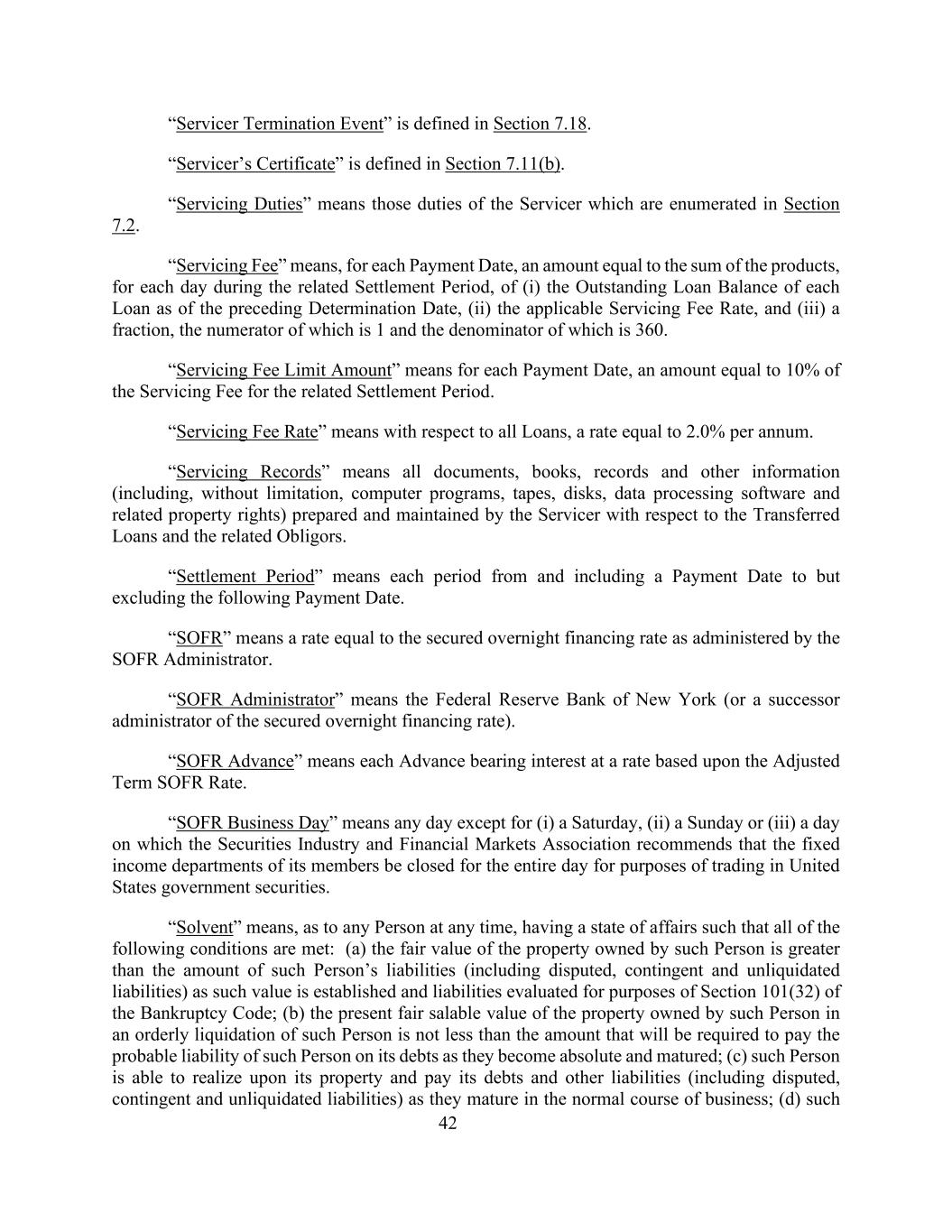 42“服务器终止事件”在第7.18节中定义。第7.11(b)节对“服务人证书”进行了定义。“服务职责”是指第7.2节中列举的服务人员的职责。“服务费”是指,就每个付款日期而言,在相关结算期内的每一天,(i)截至前一确定日期的每笔贷款的未偿还贷款余额,(ii)适用的服务费率,以及(iii)一个零头,其分子为1,分母为360。“服务费限额金额”是指每个支付日,金额等于相关结算期服务费的10%。“服务费率”是指就所有贷款而言,相当于每年2.0%的费率。「服务记录」指服务人就所转让贷款及有关债务人编制及维持的所有文件、簿册、记录及其他资料(包括但不限于计算机程序、磁带、磁盘、数据处理软件及相关产权)。“结算期”是指从(包括)一个付款日期到但不包括以下付款日期的每个期间。“SOFR”是指与SOFR管理人管理的有担保隔夜融资利率相等的利率。“SOFR管理人”是指纽约联邦储备银行(或担保隔夜融资利率的继任管理人)。“SOFR垫款”是指每笔垫款按基于调整后期限SOFR利率的利率计息。“SOFR营业日”是指除(i)周六、(ii)周日或(iii)证券业和金融市场协会建议其成员的固定收益部门全天因美国政府证券交易而关闭的任何一天。“溶剂”是指,就任何人而言,在任何时候,具有满足以下所有条件的状况:(a)该人拥有的财产的公允价值大于该人的负债金额(包括有争议的,或有负债和未清偿负债)的价值成立,并为《破产法》第101(32)条的目的对负债进行评估;(b)该人在有序清算中所拥有的财产的当前公平可销售价值不低于在其债务成为绝对债务和到期时支付该人可能的债务所需的金额;(c)该人能够在其财产上变现并支付其债务和其他负债(包括有争议的、或有负债和未清偿负债)在正常业务过程中到期;(d)此类