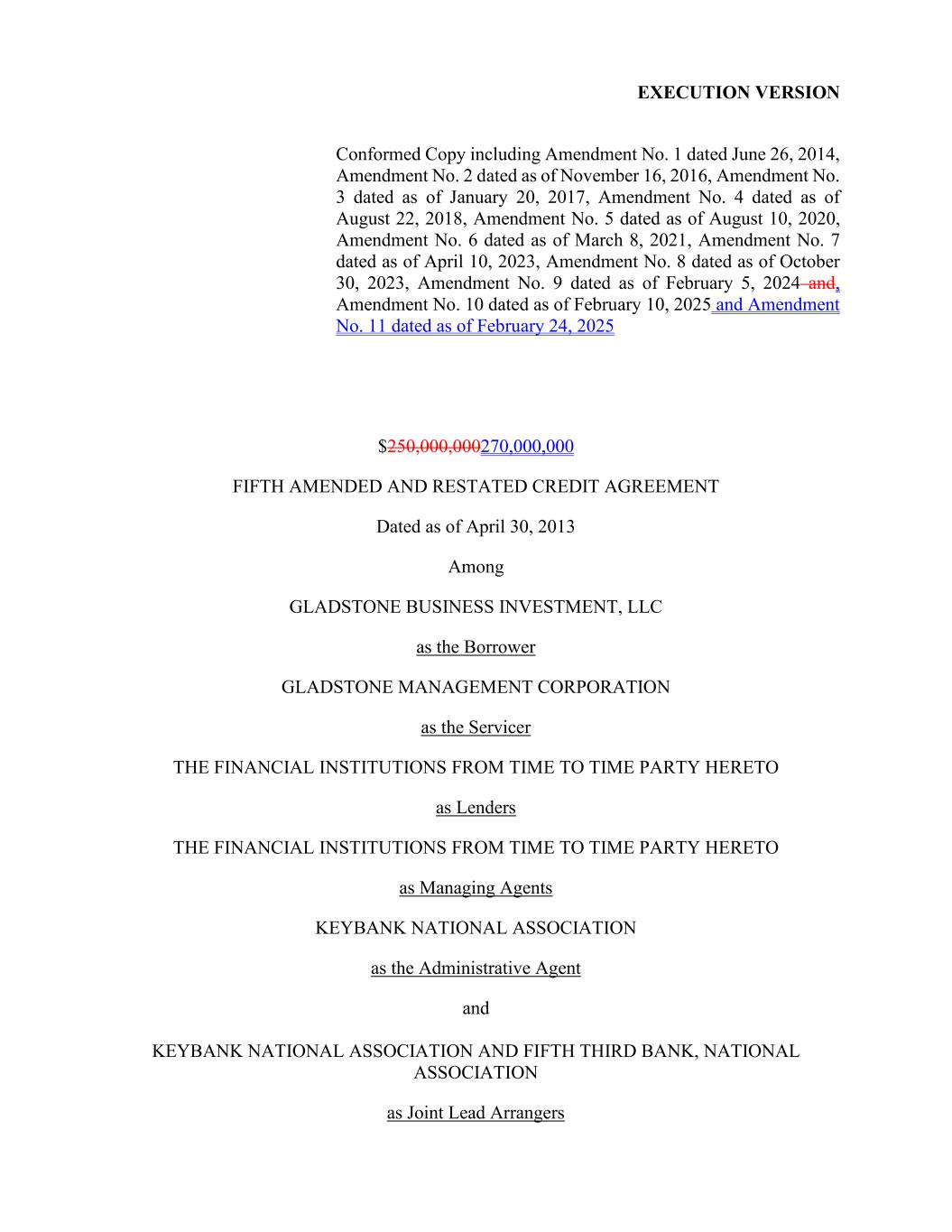 执行版本符合的副本包括2014年6月26日第1号修正案、2016年11月16日第2号修正案、2017年1月20日第3号修正案、2018年8月22日第4号修正案、2020年8月10日第5号修正案、2021年3月8日第6号修正案、2023年4月10日第7号修正案、2023年10月30日第8号修正案、2024年2月5日第9号修正案和2月10日第10号修正案,截至2025年2月24日的2025年和第11号修正案250,000,000270,000,000美元第五次修订和重述截至2013年4月30日的信贷协议Gladstone BusinessInvestment,LLC作为借款人Gladstone Management Corporation作为服务方金融机构从当时的缔约方到现在的作为贷款人金融机构从那时的缔约方到现在的作为管理代理KEYBANK NATIONAL ASIONAL作为行政代理和KEYBANK NATIONAL