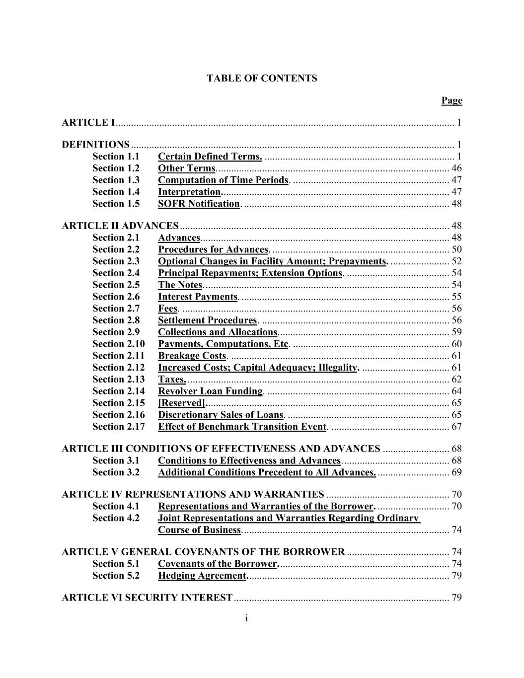 i目录页第一条................................................................................................1定义................................................................................1第1.1节某些定义术语。..................................................................1第1.2节其他用语。.....................................................................................46第1.3节时间周期的计算。...................................................................47第1.4节解读。..................................................................................47第1.5节SOFR通知。……………………………………………………………………………………………………………………………………………………………………………………………………………………………………………………………………………………………………………………………………………………………………………………………………………………………………………………………………………………………………………………………………………….......................................................................................48第2.2节垫款程序。.....................................................................50第2.3节可选变更融资金额;预付款项。.......................52第2.4节还本付息;展期选择权。......................................54第2.5节说明。.......................................................................................54第2.6节付息。.................................................................................55第2.7节收费。......................................................................................56第2.8节结算程序。.....................................................................56第2.9节征收和分配...................................................................59第2.10节付款、计算等...................................................................60第2.11节破碎费。..................................................................................61第2.12节增加成本;资本充足;违法。..................................61第2.13节税收。......................................................................................62第2.14节循环贷款资金。...................................................................64第2.15节[保留]。......................................................................................65第2.16节全权出售贷款。...................................................................65第2.17节基准转换事件的影响。................................................67第三条生效条件和进展情况................................68第3.1节生效条件和进展情况。.......................................68第3.2节所有垫款的先决条件附加条件。......................69第四条申述和保证......................................................70第4.1节借款人的申述和保证。......................70第4.2节关于正常业务过程的联合陈述和保证。................................................................................74第五条借款人的一般盟约................................................74第5.1节借款人的盟约。………………………………………………………………………………………………………………………………………………………………………………………………………………………………………………………………………………………………………………………………………………………………………………………………………………………………………………………………………………………………………………………………………………...................................................................79第六条担保权益...................................................................................................7 9