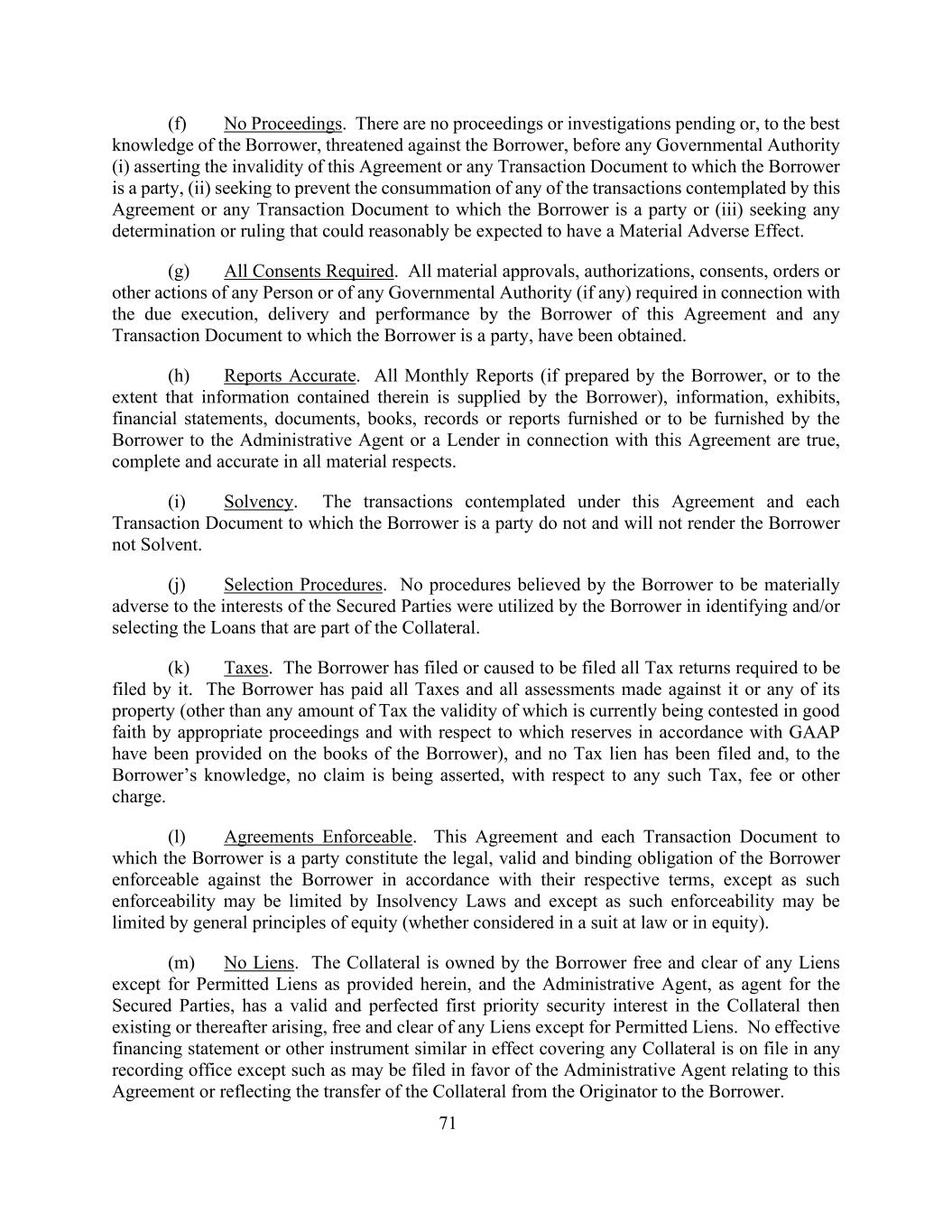 71(f)无诉讼程序。在任何政府当局(i)断言本协议或借款人作为当事方的任何交易文件无效之前,(ii)寻求阻止本协议或借款人作为当事方的任何交易文件所设想的任何交易的完成,或(iii)寻求可合理预期会产生重大不利影响的任何确定或裁决之前,没有任何程序或调查待决或据借款人所知对借款人构成威胁。(g)所需的所有同意。任何人或任何政府当局(如有的话)就借款人适当执行、交付和履行本协议和借款人作为当事方的任何交易文件所需的所有重要批准、授权、同意、命令或其他行动均已获得。(h)报告准确。所有月度报告(如由借款人编制,或在其中所载信息由借款人提供的范围内)、信息、证物、财务报表、文件、簿册、记录或借款人就本协议向行政代理人或贷款人提供或将提供的报告在所有重大方面均为真实、完整和准确的。(i)偿付能力。本协议项下拟进行的交易以及借款人作为一方当事人的每份交易文件不会也不会使借款人无法解决。(j)甄选程序。借款人在确定和/或选择作为抵押品一部分的贷款时,没有使用借款人认为对有担保当事人的利益有重大不利影响的程序。(k)税收。借款人已提交或促使提交其要求提交的所有纳税申报表。借款人已支付对其或其任何财产作出的所有税款和所有评估(但目前正通过适当程序善意质疑其有效性的任何税额除外,并已在借款人的账簿上提供了根据公认会计原则的准备金),并且没有提出任何税务留置权,而且据借款人所知,没有就任何此类税款、费用或其他费用提出索赔。(l)可强制执行的协议。本协议和借款人作为一方当事人的每份交易文件构成借款人根据各自条款可对借款人强制执行的合法、有效和具有约束力的义务,除非此类可执行性可能受到破产法的限制,并且此类可执行性可能受到一般公平原则的限制(无论是在法律诉讼中还是在公平中考虑)。(m)没有留置权。担保物由借款人拥有,除本协议规定的允许的留置权外,不存在任何留置权,行政代理人作为有担保当事人的代理人,对当时存在或其后产生的担保物享有有效和完善的第一优先担保权益,不存在除允许的留置权外的任何留置权。除可能以有利于与本协议有关的行政代理人或反映担保物从发起人转移至借款人的方式提交的情况外,任何有效的融资报表或其他在效力上涵盖任何担保物的类似文书均不在任何记录处存档。