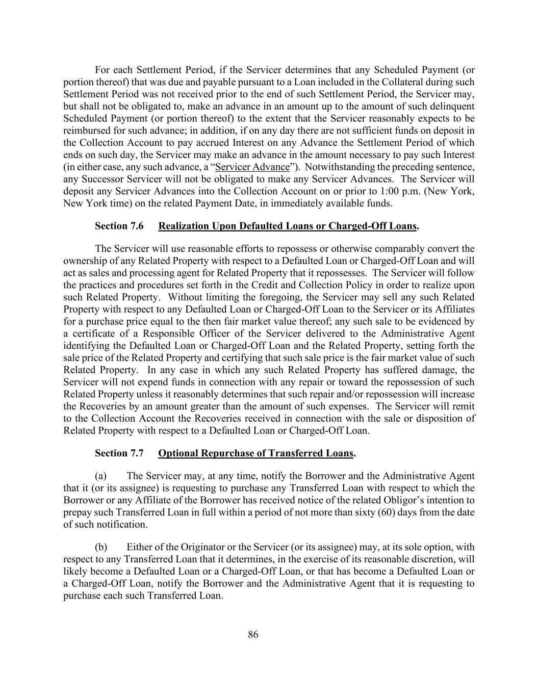 86对于每个结算期,如果服务商确定在该结算期内根据包含在抵押品中的贷款到期应付的任何预定付款(或其部分)在该结算期结束之前没有收到,则该服务商可以但不应承担义务,在该服务商合理地预期将就该预付款获得偿还的范围内,以不超过该拖欠的预定付款(或其部分)的金额为限进行预付款;此外,如果在任何一天,收款账户中没有足够的存款来支付结算期在该日结束的任何预付款的应计利息,服务商可以预付支付该利息所需的金额(在任何一种情况下,任何此类预付款,“服务商预付款”)。尽管有前一句,任何继任服务商将没有义务进行任何服务商垫款。服务商将在相关付款日期的下午1:00(纽约、纽约时间)或之前以立即可用的资金将任何服务商预付款存入收款账户。第7.6节违约贷款或核销贷款时的变现。服务商将尽合理努力收回或以其他方式比较转换与违约贷款或已核销贷款有关的任何相关财产的所有权,并将担任其收回的相关财产的销售和加工代理。服务商将遵循信用和催收政策中规定的做法和程序,以便在此类相关财产上变现。在不限制前述规定的情况下,服务人可就任何违约贷款或注销贷款向服务人或其关联公司出售任何该等相关财产,购买价格等于其当时的公平市场价值;任何该等出售须由服务人的负责人员向行政代理人交付的证明违约贷款或注销贷款及相关财产的证书证明,其中载明相关财产的销售价格,并证明该出售价格为该等相关财产的公平市场价值。在任何此类相关财产遭受损害的任何情况下,服务商将不会在任何维修或收回此类相关财产方面支出资金,除非其合理地确定此类维修和/或收回将使回收额增加的金额大于此类费用的金额。服务商将收到的与出售或处置相关财产有关的违约贷款或已核销贷款的追偿款项汇入收款账户。第7.7节转让贷款的可选回购。(a)服务人可随时通知借款人及行政代理人,其(或其受让人)正要求购买借款人或借款人的任何附属公司已收到有关债务人打算在该通知发出之日起不超过六十(60)天的期间内全额预付该转让贷款的通知所涉及的任何转让贷款。(b)发起人或服务人(或其受让人)中的任何一方可自行选择,就其在行使合理酌情权时确定很可能成为违约贷款或已核销贷款,或已成为违约贷款或已核销贷款的任何转让贷款,通知借款人和行政代理人,其正在请求购买每笔此类转让贷款。