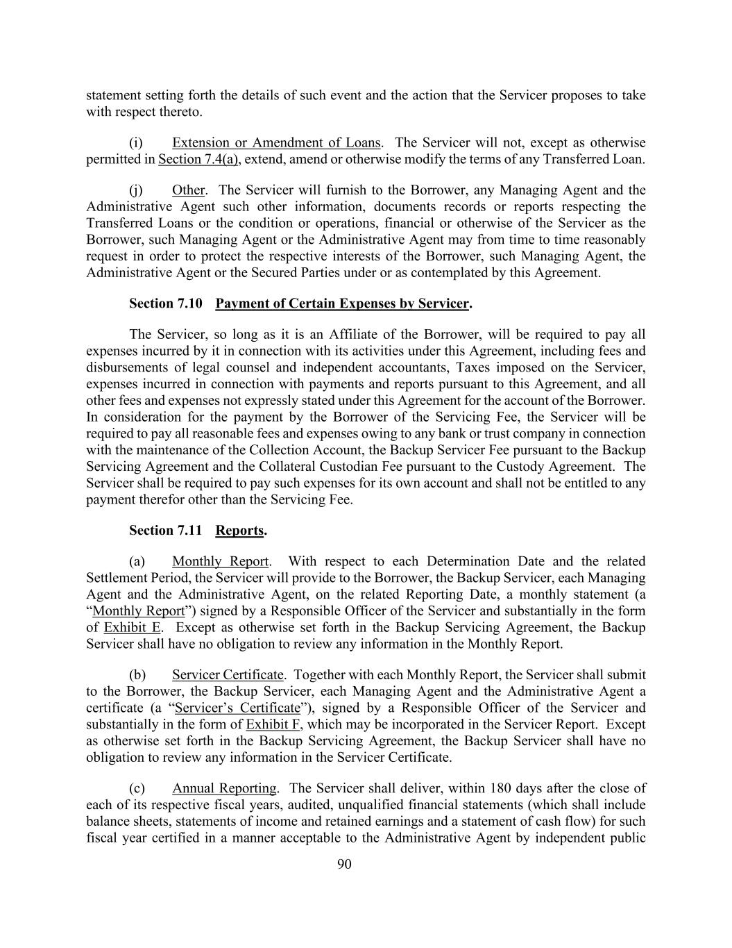 90声明,阐明此类事件的细节以及服务商提议就此采取的行动。(i)延长或修订贷款。除第7.4(a)条另有许可外,服务人将不会延长、修订或以其他方式修改任何转让贷款的条款。(j)其他。服务人将向借款人、任何管理代理人和行政代理人提供关于所转让贷款或作为借款人的服务人的状况或经营、财务或其他方面的其他信息、文件记录或报告,该管理代理人或行政代理人可不时合理要求,以保护借款人、该管理代理人、行政代理人或本协议项下或本协议所设想的担保方各自的利益。第7.10节服务者支付某些费用。服务商,只要是借款人的附属公司,将被要求支付其根据本协议开展的活动所产生的所有费用,包括法律顾问和独立会计师的费用和支出、对服务商征收的税款、与根据本协议支付的款项和报告有关的费用,以及根据本协议未明确规定的借款人账户的所有其他费用和开支。作为借款人支付服务费的代价,服务人将须支付欠任何银行或信托公司的所有合理费用及开支,与维持收款账户、根据备用服务协议的备用服务人费及根据托管协议的附属托管费有关。服务者应被要求为自己的账户支付此类费用,除服务费外,无权为此获得任何付款。第7.11节报告。(a)月度报告。就每个确定日期和相关结算期而言,服务商将在相关报告日向借款人、备用服务商、每个管理代理和行政代理提供一份由服务商负责官员签署且基本上以附件 E形式存在的月度报表(“月度报告”)。除备用服务协议另有规定外,备用服务商没有义务审查月度报告中的任何信息。(b)服务人员证书。连同每份月度报告,服务商应向借款人、备用服务商、每个管理代理和行政代理提交一份证书(“服务商证书”),该证书由服务商的一名负责官员签署,且基本上以附件 F的形式出现,该证书可并入服务商报告。除备份服务协议另有规定外,备份服务商没有义务审查服务商证书中的任何信息。(c)年度报告。服务商应在其各自会计年度结束后的180日内,以独立公众可接受的方式交付经审计的、无保留意见的该会计年度的财务报表(其中应包括资产负债表、损益表和留存收益表以及现金流量表)