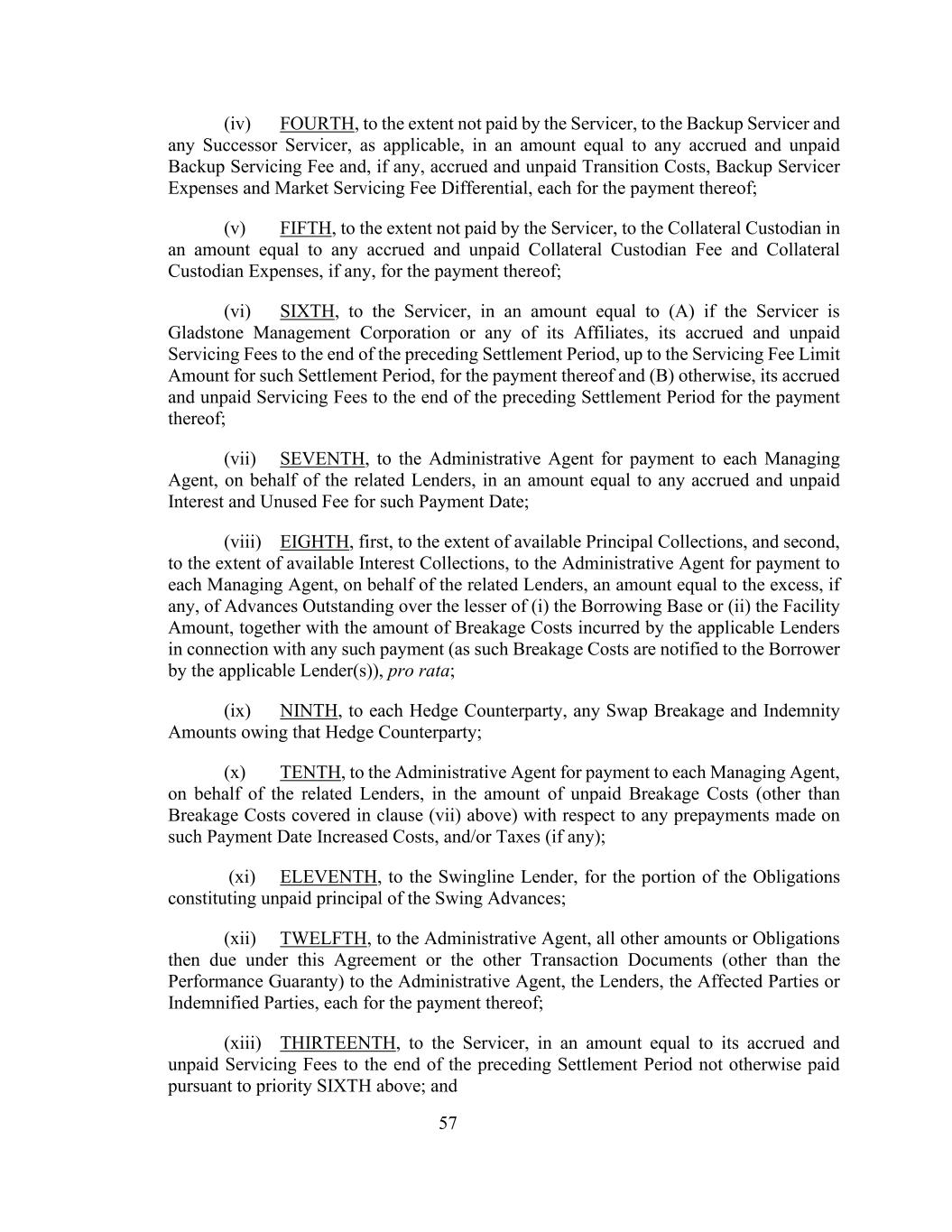 57(iv)在服务商未支付的范围内,向备用服务商和任何继任服务商(如适用)支付第四笔款项,金额相当于任何应计和未支付的备用服务费,以及(如有)应计和未支付的过渡费用、备用服务商费用和市场服务费差额,每笔款项均用于支付;(v)在服务商未支付的范围内,向附属托管人支付第五笔款项,金额相当于任何应计和未支付的附属托管费和附属托管费用(如有),用于支付;(vi)第六笔款项,向服务商,金额等于(a)如服务人是Gladstone Management Corporation或其任何附属公司,则其截至上一结算期结束时的应计未付服务费,最高可达该结算期的服务费限额金额,以供支付;及(b)否则,其截至上一结算期结束时的应计未付服务费以供支付;(vii)第七,代相关贷款人向行政代理人支付给各管理代理人,金额相当于该付款日期的任何应计未付利息和未使用费用;(viii)第八项,第一项,以可用的本金收款为限,第二项,以可用的利息收款为限,向行政代理人支付代表相关贷款人向各管理代理人支付的金额,金额等于(i)借款基数或(ii)融资金额中较低者的未偿预付款的超额部分(如有),连同适用的放款人就任何该等付款而招致的破碎费金额(因为该等破碎费由适用的放款人(s)通知借款人),按比例计算;(ix)第九次,向每一对冲对手方,拖欠该对冲对手方的任何掉期破碎费和赔偿额;(x)第十次,向行政代理人代表相关放款人就在该付款日期作出的任何预付款项支付的未付破碎费金额(上述第(vii)条所涵盖的破碎费除外)增加的费用,和/或税款(如有);(xi)第十一次,向Swingline贷款人支付构成周转预付款未付本金的部分债务;(xii)第十二次,向行政代理人支付根据本协议或其他交易文件(履约保函除外)当时应向行政代理人、贷款人、受影响各方或受赔偿各方支付的所有其他款项或义务;(xiii)第十三次,向服务商支付相当于其截至上一个结算期结束时的应计未付服务费的金额,但未根据上述优先顺序第六次支付;和