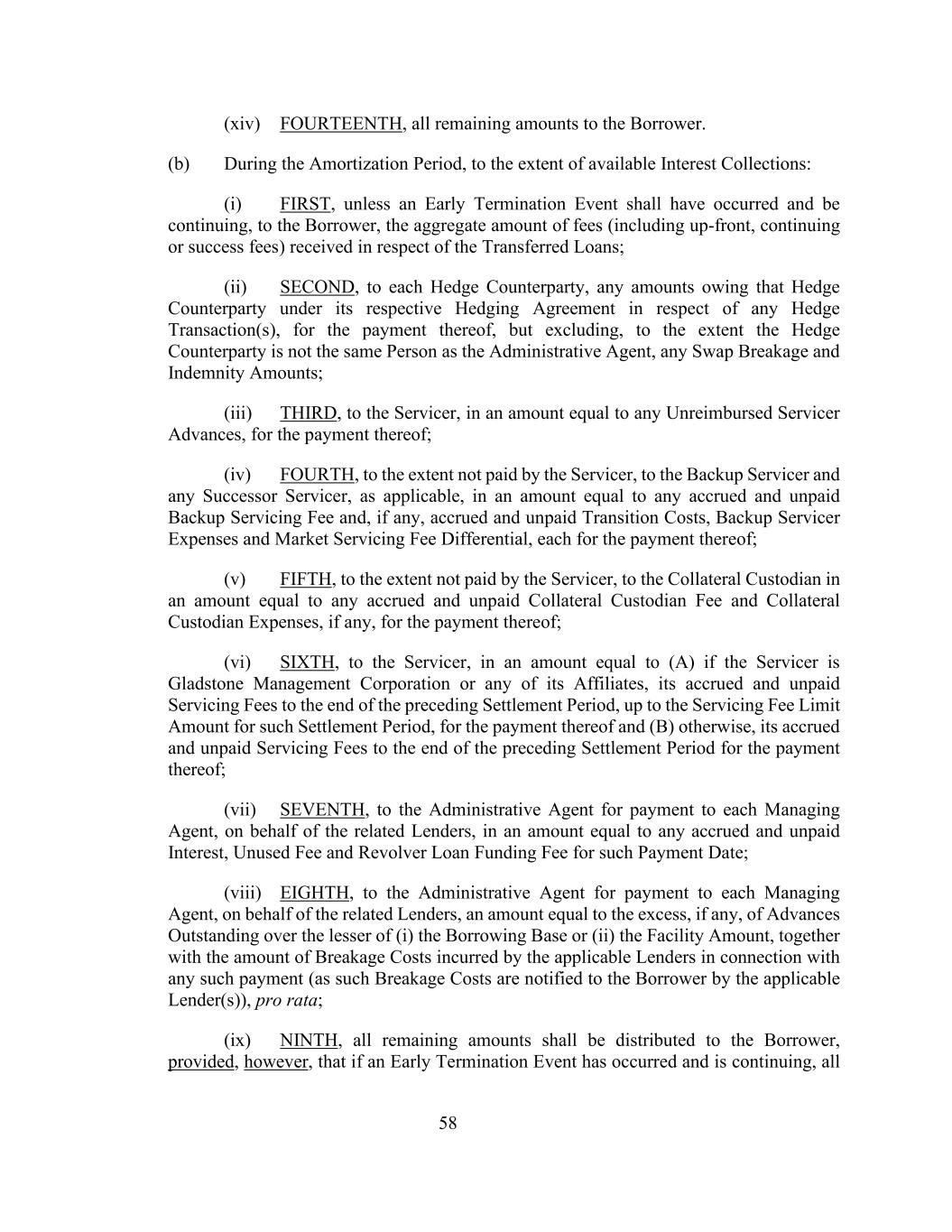 58(xiv)第十四条,所有剩余金额归借款人所有。(b)在摊销期内,在可收取利息的范围内:(i)首先,除非已发生并正在继续发生提前终止事件,否则就转让的贷款向借款人收取的费用总额(包括前期、持续或成功费用);(ii)第二,向每一对冲对手方支付根据其各自的对冲协议就任何对冲交易所欠该对冲对手方的任何款项,以支付该款项,但在对冲对手方与行政代理人不是同一人的情况下,不包括任何掉期违约和赔偿金额;(iii)第三,向服务商支付,金额相当于任何未偿还的服务商垫款,用于支付;(iv)在服务商未支付的范围内,向备用服务商和任何继任服务商(如适用)支付第四笔款项,金额相当于任何应计和未支付的备用服务费,以及(如有)应计和未支付的过渡成本、备用服务商费用和市场服务费差额,每笔款项均用于支付;(v)在服务商未支付的范围内,向抵押托管人支付第五笔款项,金额相当于任何应计和未支付的抵押托管费和抵押托管费用,如有,则为支付;(vi)第六次,向服务商支付,金额等于(a)如果服务商是Gladstone Management Corporation或其任何关联公司,其截至上一个结算期结束时的应计未付服务费,不超过该结算期的服务费限额金额,以支付该款项;(b)否则,其截至上一个结算期结束时的应计未付服务费,以支付该款项;(vii)第七次,向行政代理人支付,以代表相关贷款人,金额相当于该付款日期的任何应计和未付利息、未使用费用和循环贷款融资费;(viii)第八次,代表相关贷款人向行政代理人支付给每一管理代理人的款项,金额等于(i)借款基数或(ii)融资金额中较低者的未偿预付款的超出部分(如有),连同适用贷款人就任何此类付款所产生的破碎费用金额(因为此类破碎费用由适用贷款人(s)按比例通知借款人);(ix)第九次,所有剩余金额应分配给借款人,但前提是,如果提前终止事件已经发生并仍在继续,所有