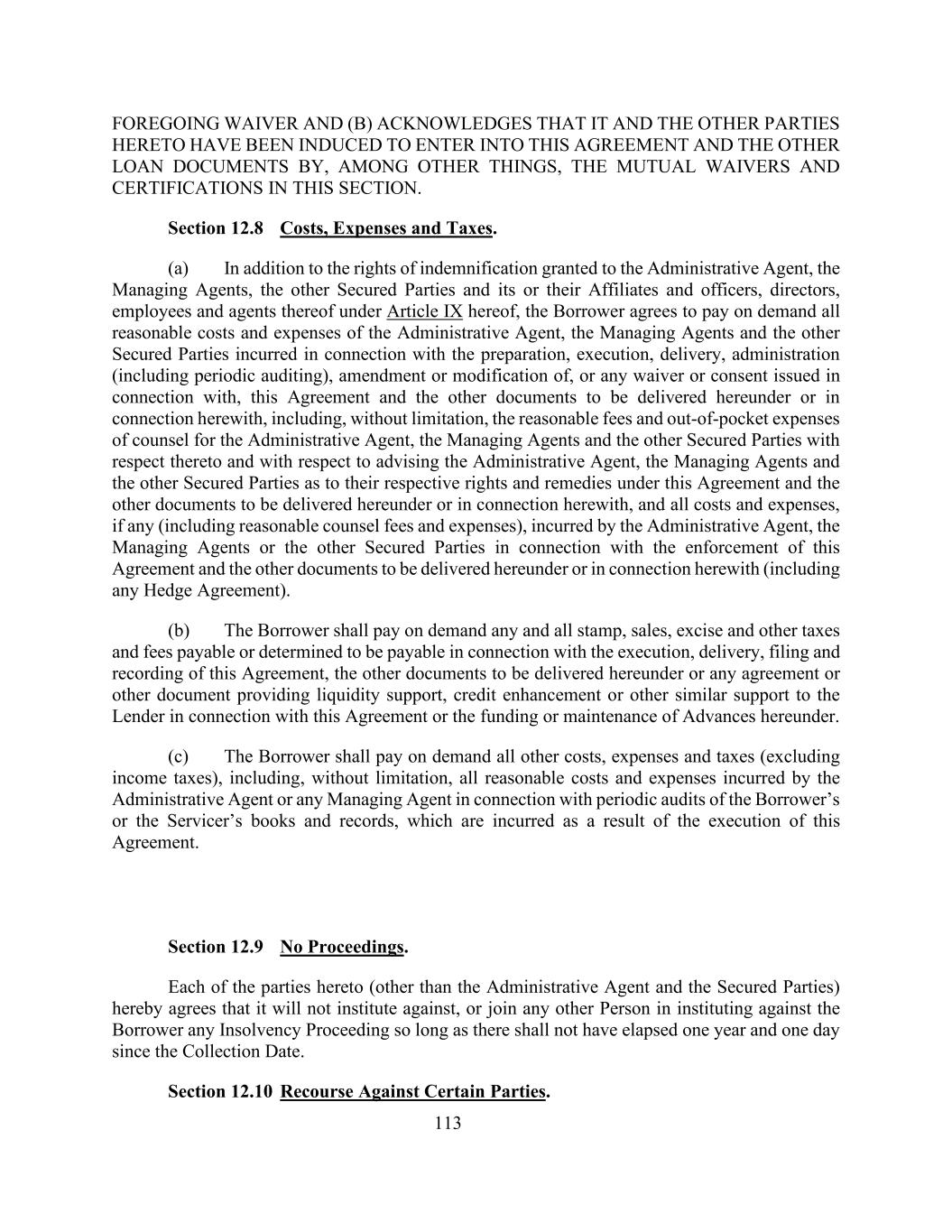113上述豁免和(b)承认,除其他外,本节中的相互豁免和证明已促使其与本协议的其他各方订立本协议和其他贷款文件。第12.8节成本、费用和税收。(a)除根据本协议第九条授予行政代理人、管理代理人、其他有担保方及其附属机构和高级管理人员、董事、雇员及其代理人的赔偿权利外,借款人同意按要求支付行政代理人、管理代理人和其他有担保方因编制、执行、交付、管理(包括定期审计)、修改或修改,或与此有关的任何放弃或同意而招致的一切合理成本和费用,本协议及根据本协议交付或与本协议有关的其他文件,包括但不限于行政代理人、管理代理人和其他有担保当事人的律师的合理费用和自付费用,以及就行政代理人、管理代理人和其他有担保当事人各自在本协议项下的权利和补救办法以及根据本协议或与本协议有关的其他文件交付的权利和补救办法,以及行政代理人发生的一切费用和开支(如有)(包括合理的律师费用和开支),管理代理或其他有担保方就本协议的强制执行以及根据本协议或与本协议有关的其他文件(包括任何对冲协议)交付。(b)借款人应按要求支付与本协议的执行、交付、备案和记录、根据本协议将交付的其他文件或就本协议或根据本协议提供资金或维持垫款而向贷款人提供流动性支持、信用增进或其他类似支持的任何协议或其他文件有关的任何和所有应付或确定应付的印花、销售、消费税和其他税费。(c)借款人应按要求支付所有其他成本、费用和税款(不包括所得税),包括但不限于行政代理人或任何管理代理人因执行本协议而产生的与定期审计借款人或服务人的簿册和记录有关的所有合理成本和费用。第12.9节没有诉讼程序。协议各方(行政代理人和有担保方除外)在此同意,只要自收款之日起未经过一年零一天,其将不对借款人提起或与任何其他人一起对借款人提起任何破产程序。第12.10节对某些当事人的追索。