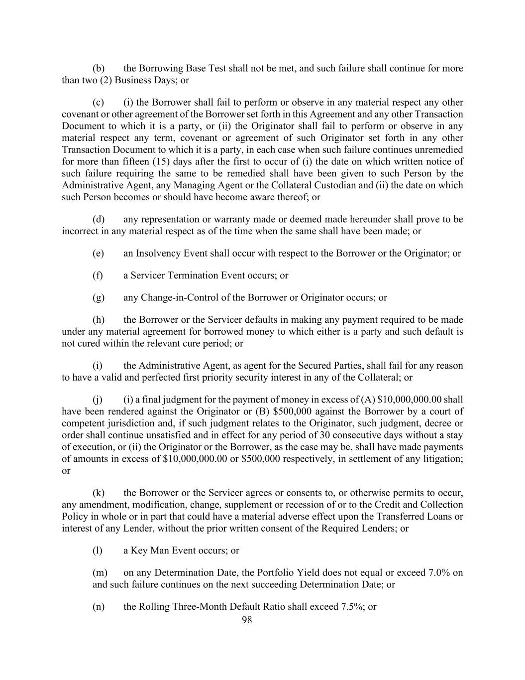 98(b)借款基础测试不得满足,且该等失败须持续超过两(2)个营业日;或(c)(i)借款人不得在任何重要方面履行或遵守本协议及其为一方的任何其他交易文件所载的借款人的任何其他契诺或其他协议,或(ii)发起人不得在任何重要方面履行或遵守其为一方的任何其他交易文件所载的该发起人的任何条款、契诺或协议,在每宗个案中,如该等失责在(i)行政代理人应已向该人发出要求就该等失责作出补救的书面通知之日起首次发生后超过十五(15)天仍未获补救,任何管理代理人或抵押品托管人(ii)该人成为或应已知悉的日期;或(d)根据本协议作出或当作作出的任何陈述或保证,自作出该等陈述或保证时起,须证明在任何重大方面是不正确的;或(e)就借款人或发起人发生破产事件;或(f)发生服务人终止事件;或(g)借款人或发起人的控制权发生任何变更;或(h)借款人或服务人拖欠根据任何重大协议规定作出的任何付款对于任何一方为当事人且该违约未在相关补救期内得到纠正的借款;或(i)行政代理人作为有担保当事人的代理人,不得因任何理由未能在任何担保物上拥有有效和完善的第一优先担保权益;或(j)(i)有管辖权的法院应已就支付超过(a)10,000,000.00美元的款项向发起人或(b)500,000美元向借款人作出最终判决,如果该判决与发起人有关,则该判决,判令或命令须在任何连续30天期间持续不获满足及有效,而无须中止执行,或(ii)发起人或借款人(视属何情况而定)为解决任何诉讼已分别支付超过10,000,000.00美元或500,000美元的款项;或(k)借款人或服务人同意或同意,或以其他方式准许发生任何修订、修改、变更,未经所需贷款人事先书面同意,可能对任何贷款人的已转让贷款或利息产生重大不利影响的全部或部分信贷和催收政策的补充或衰退;或(l)发生关键人物事件;或(m)在任何确定日期,投资组合收益率在下一个确定日期不等于或超过7.0%,且该失败在下一个确定日期继续;或(n)滚动三个月违约率应超过7.5%;或