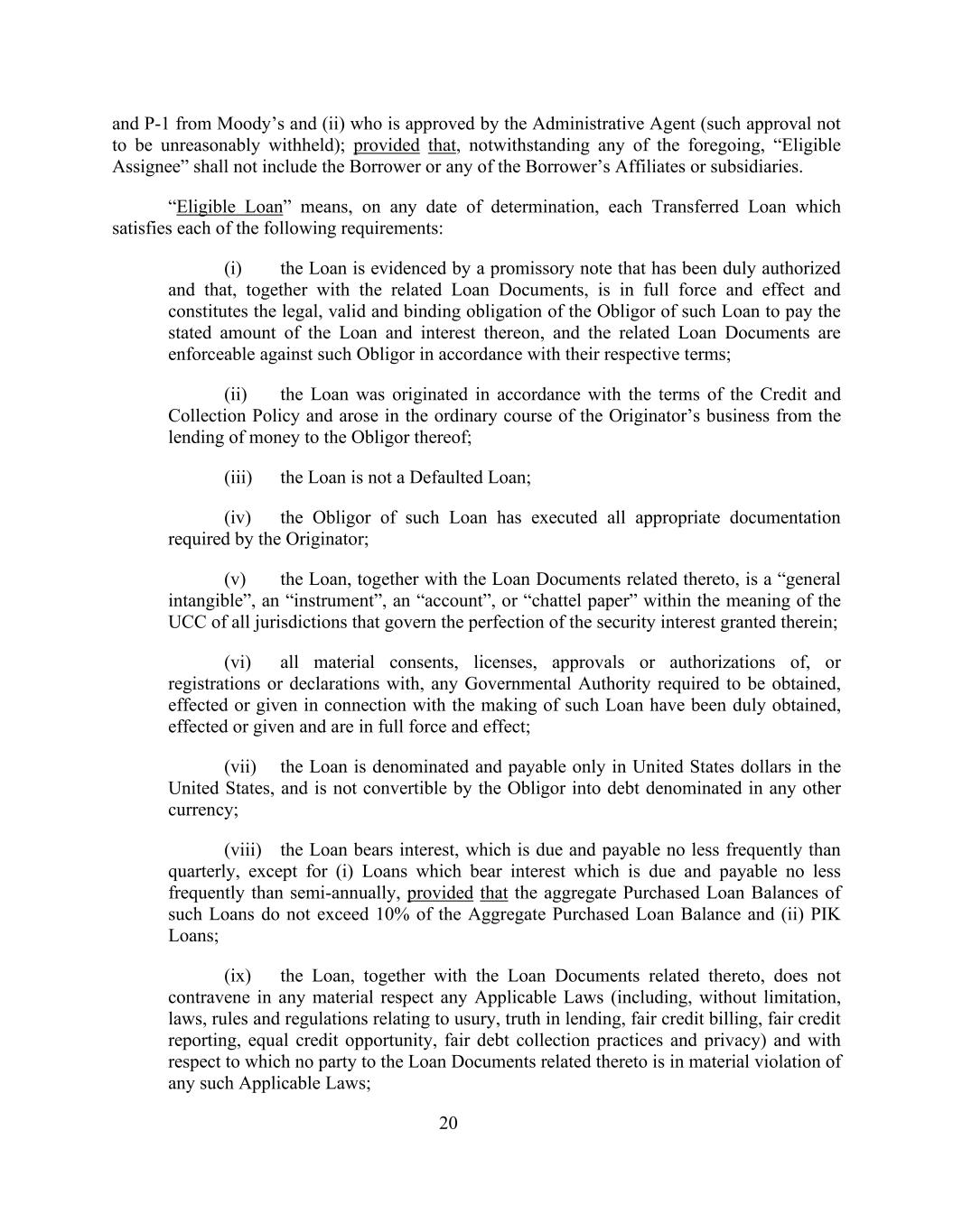20和P-1来自穆迪和(ii)获得行政代理人批准的人(此类批准不得被无理拒绝);但尽管有上述任何规定,“合格受让人”不应包括借款人或借款人的任何关联公司或子公司。“合资格贷款”是指,在任何确定日期,满足以下各项要求的每一笔转让贷款:(i)该贷款由已获正式授权的本票证明,且连同相关贷款文件具有充分的效力和效力,并构成该贷款的债务人支付所述贷款金额及其利息的合法、有效和具有约束力的义务,且相关贷款文件可根据其各自条款对该等债务人强制执行;(ii)该贷款是根据信贷和催收政策的条款产生的,并在发起人的正常业务过程中产生于向其债务人出借款项;(iii)该贷款不是违约贷款;(iv)该贷款的债务人已签署发起人要求的所有适当文件;(v)该贷款连同与其相关的贷款文件是“一般无形资产”、“工具”、“账户”,或管辖其中所授担保权益的完善的所有法域的UCC所指的“动产票据”;(vi)就作出该等贷款而须取得、生效或给予的任何政府当局的所有重要同意、许可、批准或授权,或向其登记或声明,均已妥为取得、生效或给予,并具有完全效力及效力;(vii)该贷款仅在美国以美元计值及支付,且不可由债务人转换为以任何其他货币计值的债务;(viii)贷款有利息,到期和支付的频率不低于每季度,但(i)贷款有利息,到期和支付的频率不低于每半年一次,前提是此类贷款的已购买贷款余额总额不超过已购买贷款余额总额的10%,以及(ii)PIK贷款;(ix)该贷款连同与之相关的贷款文件在任何重大方面均不违反任何适用法律(包括但不限于法律、与高利贷、借贷真相、公平信贷账单、公平信用报告、平等信贷机会、公平讨债做法和隐私有关的规则和条例),并且与此相关的贷款文件的任何一方均不存在重大违反任何此类适用法律的情况;