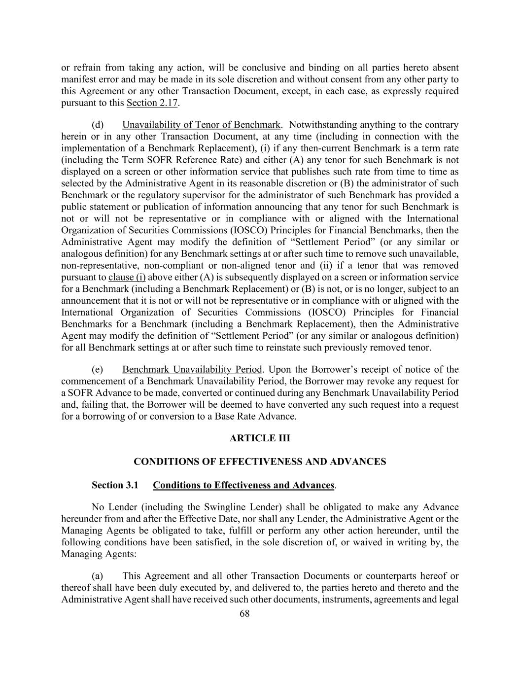 68或不采取任何行动,将是决定性的,在没有明显错误的情况下对协议各方均具有约束力,并可自行酌情作出,且无需获得本协议或任何其他交易文件的任何其他方的同意,但在每种情况下,根据本节2.17明确要求的除外。(d)无法获得基准期限。尽管本文或任何其他交易文件中有任何相反的规定,但在任何时候(包括与实施基准更换有关的),(一)如任何当时的基准为定期利率(包括定期SOFR参考利率),且(a)该基准的任何期限未显示在不时公布行政代理人合理酌情所选定的该利率的屏幕或其他信息服务上,或(b)该基准的管理人或该基准的管理人的监管主管已提供公开声明或公布信息,宣布此类基准的任何期限不具有或将不具有代表性,或不符合或与国际证监会组织(IOSCO)的金融基准原则保持一致,则行政代理人可在该时间或之后修改任何基准设置的“结算期”定义(或任何类似或类似定义),以删除此类不可用、不具代表性、不符合或不一致的期限和(ii)如果根据上述(a)项中的第(i)款被删除的期限随后显示在基准的屏幕或信息服务上(包括基准替换)或(b)不是或不再受以下公告的约束:该期限不具有或将不具有代表性,或不符合或符合国际证券委员会组织(IOSCO)关于基准的财务基准原则(包括基准替换),然后,行政代理人可以在该时间或之后修改所有基准设置的“结算期”定义(或任何类似或类似的定义),以恢复该先前取消的期限。(e)基准不可用期限。在借款人收到基准不可用期间开始的通知后,借款人可撤销在任何基准不可用期间提出、转换或继续进行SOFR垫款的任何请求,否则,借款人将被视为已将任何此类请求转换为借入或转换为基准利率垫款的请求。第三条生效条件和提前款第3.1节生效条件和提前款。任何贷款人(包括Swingline贷款人)自生效之日起及之后均无义务根据本协议进行任何垫款,任何贷款人、行政代理人或管理代理人亦无义务采取、履行或执行本协议项下的任何其他行动,直至以下条件已获满足,由管理代理人全权酌情决定或书面放弃:(a)本协议及所有其他交易文件或本协议或其对应物已妥为签立,并交付予,本协议及本协议的当事人、行政代理人应当已收到该等其他文件、文书、协议和法律