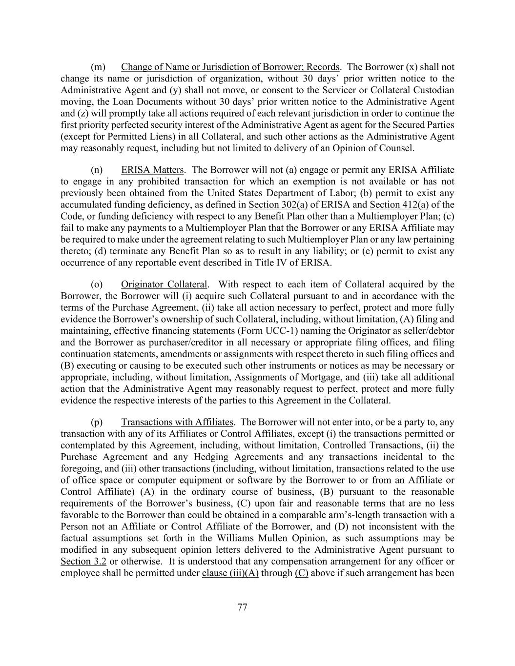 77(m)变更借款人的名称或管辖权;记录。借款人(x)不得变更其名称或组织管辖权,未经提前30天书面通知行政代理人和(y)不得移动,或未经服务人或担保品托管人同意移动,未经提前30天书面通知行政代理人和(z)将迅速采取各相关法域要求的一切行动,以延续行政代理人作为担保当事人的代理人在所有担保品上的第一优先权完善的担保权益(允许的留置权除外),以及行政代理人可能合理要求的其他行为,包括但不限于送达律师意见。(n)ERISA事项。借款人将不会(a)聘用或允许任何ERISA关联公司从事任何无法获得豁免或以前未从美国劳工部获得豁免的禁止交易;(b)允许存在ERISA第302(a)节和《守则》第412(a)节所定义的任何累积资金短缺,或与多雇主计划以外的任何福利计划有关的资金不足;(c)未能向借款人或任何ERISA关联公司根据与该多雇主计划有关的协议或与其相关的任何法律可能被要求支付的多雇主计划支付任何款项;(d)终止任何福利计划从而导致任何责任;或(e)允许存在ERISA标题IV中描述的任何可报告事件的任何发生。(o)发起人抵押品。对于借款人获得的每一项抵押品,借款人将(i)根据并根据购买协议的条款获得此类抵押品,(ii)采取一切必要行动,以完善、保护和更充分地证明借款人对此类抵押品的所有权,包括但不限于(a)在所有必要或适当的归档办公室归档并维持有效的融资报表(UCC-1表格),将发起人指定为卖方/债务人,将借款人指定为买方/债权人,并提交延续报表,在该等备案处作出与此有关的修订或转让,以及(b)执行或促使执行可能需要或适当的其他文书或通知,包括但不限于抵押转让,以及(iii)采取行政代理人可能合理要求的所有额外行动,以完善、保护和更充分地证明本协议各方在担保物中的各自利益。(p)与关联公司的交易。借款人将不与其任何关联公司或控制关联公司进行任何交易或成为其一方,但(i)本协议允许或设想的交易,包括但不限于受控交易,(ii)购买协议和任何套期保值协议以及前述附带的任何交易,以及(iii)其他交易(包括但不限于与借款人向关联公司或控制关联公司使用办公空间或计算机设备或软件有关的交易)(a)在正常业务过程中,(b)根据借款人业务的合理要求,(c)以公平合理的条款对借款人不低于在与非借款人的关联公司或控制关联公司的人进行的可比公平交易中可能获得的有利条件,以及(d)不与威廉姆斯 Mullen意见中所述的事实假设不矛盾,因为这些假设可能会在随后根据第3.2节或其他方式交付给行政代理人的任何意见函中进行修改。据了解,任何高级人员或雇员的任何补偿安排,如已根据上文第(iii)(a)至(c)条获准许,则