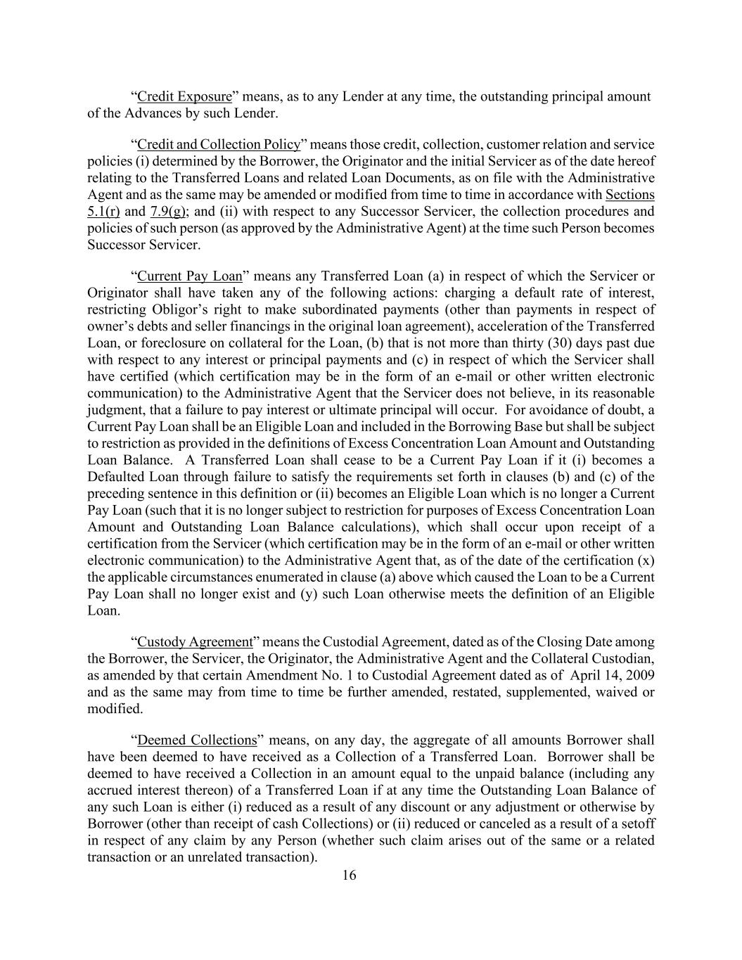 16“信贷敞口”是指,就任何贷款人而言,在任何时候,该贷款人的垫款未偿还本金金额。“信贷和催收政策”是指借款人、发起人和初始服务商于本协议日期就转让的贷款和相关贷款文件确定的信贷、催收、客户关系和服务政策(i),如在行政代理人处存档,并可能根据第5.1(r)和7.9(g)条不时修订或修改;以及(ii)就任何继任服务商而言,该人(经行政代理人批准)在该人成为继任服务商时的催收程序和政策。“流动支付贷款”是指任何转让的贷款(a),服务商或发起人应已就其采取以下任何行动:收取违约利率、限制债务人进行次级付款的权利(原始贷款协议中关于所有者债务和卖方融资的付款除外)、加速转让的贷款或取消贷款抵押品的赎回权,(b)就任何利息或本金付款逾期不超过三十(30)天,及(c)就该等利息或本金付款,服务人须已向行政代理人证明(该证明可采用电子邮件或其他书面电子通讯的形式)服务人在其合理判断中认为不会发生未能支付利息或最终本金的情况。为免生疑问,流动支付贷款应为符合条件的贷款,并纳入借款基数,但应受到超额集中贷款金额和未偿还贷款余额定义中规定的限制。转让的贷款,如果(i)因未能满足本定义中前一句(b)和(c)条规定的要求而成为违约贷款,或(ii)成为不再是当期支付贷款的合格贷款(从而不再因超额集中贷款金额和未偿还贷款余额计算而受到限制),即不再是当期支付贷款,这种情况应在收到服务人向行政代理人发出的证明(该证明可以是电子邮件或其他书面电子通信的形式)时发生,即自证明(x)之日起,上述(a)条中列举的导致贷款为当期支付贷款的适用情况将不复存在,并且(y)该贷款在其他方面符合合格贷款的定义。「托管协议」指由借款人、服务人、发起人、行政代理人及附属保管人于截止日期订立的托管协议,经于2009年4月14日对托管协议作出的该特定修订第1号修订修订,并可能不时进一步修订、重述、补充、放弃或修改。“视为收款”是指,在任何一天,借款人应被视为已收到的所有金额的总和为已转让贷款的收款。如任何该等贷款的未偿还贷款余额在任何时候(i)因任何折扣或任何调整或借款人以其他方式(收取现金收款除外)而减少或(ii)因任何人就任何索赔提出的抵销而减少或取消(不论该索赔是由同一或相关交易或不相关交易产生),则借款人应被视为已收到相当于所转让贷款的未付余额(包括其任何应计利息)的收款。