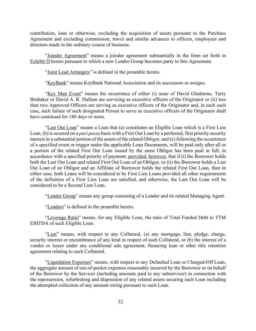 32出资、贷款、贷款或其他方式,不包括根据购买协议收购资产,也不包括在正常业务过程中向高级职员、雇员和董事提供的佣金、差旅和类似预付款。“合并协议”是指基本上采用本协议附件 D所述形式的合并协议,据此,一个新的贷款人集团将成为本协议的一方。“联合牵头安排安排人”在本协议序言中定义。“KeyBank”是指KeyBank全国协会及其继任者或指派人员。“关键人物事件”是指发生以下任一情况:(i)David Gladstone、Terry L. Brubaker或David A. R. Dullum均未担任发起人的执行官,或(ii)担任发起人的执行官的获批准人员少于两名,并且在每种情况下,该指定人员未能担任发起人的执行官的情况应持续180天或更长时间。“Last Out Loan”是指(a)构成符合条件的贷款且为第一留置权贷款,(b)在同等基础上以相关债务人大部分资产上的完善的第一优先担保权益作为优先贷款的担保,以及(c)在发生适用贷款文件项下的特定事件或触发后,只有在同一债务人发放的相关优先贷款全部或部分已全额支付后,才能支付的贷款,但前提是,如果(i)借款人同时持有债务人的最后一笔贷款和相关的先出贷款,或(ii)借款人持有债务人的最后一笔贷款,而借款人的关联公司持有相关的先出贷款,则在任一情况下,只要满足第一留置权贷款定义的所有其他要求,这两笔贷款将被视为第一留置权贷款,否则,最后一笔贷款将被视为第二留置权贷款。“出借人集团”是指由出借人及其相关管理代理组成的任何集团。“放款人”序言部分对“放款人”进行了定义。“杠杆率”是指,对于任何符合条件的贷款,已融资的总债务与此类符合条件贷款的TTM EBITDA的比率。“留置权”就任何抵押品而言,是指(a)与该抵押品有关的任何抵押、留置权、质押、押记、担保权益或任何种类的产权负担,或(b)卖方或出租人根据与该抵押品有关的任何有条件销售协议、融资贷款或其他所有权保留协议所享有的权益。“清算费用”是指,就任何违约贷款或已核销贷款而言,借款人或由服务商代表借款人合理承担的自付费用总额(包括支付给任何分服务商的金额),与收回、翻新和处置为此类贷款提供担保的任何相关资产有关,包括试图收取根据此类贷款所欠的任何金额。
