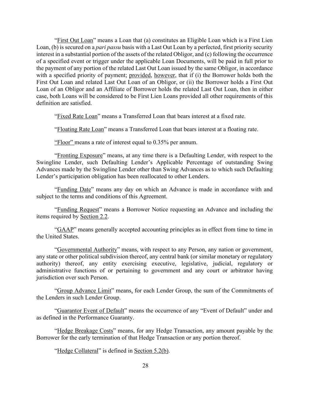 28“先出贷款”是指以下贷款:(a)构成符合条件的贷款,即第一留置权贷款,(b)由相关债务人的大部分资产上的完善的第一优先担保权益以与后出贷款同等的基础上作担保,以及(c)在发生适用贷款文件下的特定事件或触发后,将在同一债务人根据特定的支付优先权发放的相关后出贷款的任何部分支付之前全额支付;但是,前提是,如果(i)借款人同时持有债务人的先出贷款和相关的后出贷款,或(ii)借款人持有债务人的先出贷款,而借款人的关联公司持有相关的后出贷款,则在任一情况下,只要满足本定义的所有其他要求,这两笔贷款将被视为优先留置权贷款。“固定利率贷款”是指按固定利率计息的转让贷款。“浮动利率贷款”是指以浮动利率计息的转让贷款。“下限”是指年利率等于0.35%的利率。“Fronting Exposure”是指,在任何时候都存在违约贷款人,就Swingline贷款人而言,该违约贷款人的适用百分比为该违约贷款人的参与义务已重新分配给其他贷款人的Swingline贷款人所提供的除Swingline Advances之外的未偿Swingline Advances。“融资日期”是指根据本协议的条款和条件并受其约束进行垫款的任何一天。“资金请求”是指借款人通知,要求提供预付款并包括第2.2节要求的项目。“GAAP”是指在美国不时生效的公认会计原则。“政府当局”是指,就任何人、任何国家或政府、其任何州或其他政治分支机构、其任何中央银行(或类似的货币或监管机构)、行使政府行政、立法、司法、监管或行政职能或与政府有关的任何实体以及对此人具有管辖权的任何法院或仲裁员而言。“集团垫付限额”是指,对于每个贷款组,贷款方在该贷款组中的承诺的总和。“担保人违约事件”是指履约保证项下及所定义的任何“违约事件”的发生。“对冲打破成本”是指,对于任何对冲交易,借款人因提前终止该对冲交易或其任何部分而应支付的任何金额。“对冲抵押品”的定义见第5.2(b)节。