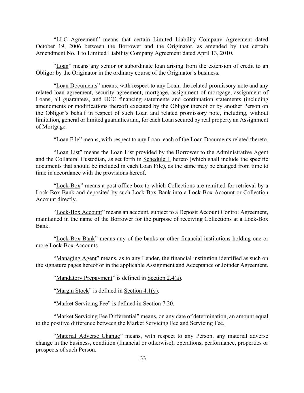 33“有限责任公司协议”指借款人与发起人于2006年10月19日签署的某些有限责任公司协议,经2010年4月13日对有限责任公司协议的第1号某些修订修订。“贷款”是指在发起人正常经营过程中,因发起人向债务人提供信贷而产生的任何高级或次级贷款。“贷款文件”是指,就任何贷款而言,相关的本票和任何相关的贷款协议、担保协议、抵押、抵押的转让、贷款的转让、所有担保,以及由其债务人或由另一人代表债务人就该等贷款和相关本票签立的UCC融资报表和延续报表(包括其修订或修改),包括但不限于一般或有限担保,以及就每笔以不动产作担保的贷款而言的抵押转让。“贷款档案”是指,就任何贷款而言,与之相关的每一份贷款文件。“借款清单”是指借款人按照本协议附表二的规定,向行政代理人和抵押物托管人提供的借款清单(其中应包括每一借款档案中应包括的具体文件),该清单可能会根据本协议的规定不时更改。“锁箱”是指由锁箱银行将藏品汇入其中进行检索,并由该锁箱银行直接存入锁箱账户或藏品账户的邮政信箱。“锁箱账户”是指根据存款账户控制协议,以借款人名义维持的、用于在锁箱银行接收收款的账户。“锁箱银行”是指持有一个或多个锁箱账户的任何银行或其他金融机构。“管理代理人”是指,就任何贷款人而言,在本协议的签字页上或在适用的转让和接受或合并协议中被确定为这样的金融机构。“强制提前还款”的定义见第2.4(a)节。“保证金股票”的定义见第4.1(y)节。“市场服务费”在第7.20节中定义。“市场服务费差额”是指,在任何确定日期,等于市场服务费与服务费正差的金额。“重大不利变化”就任何人而言是指该人的业务、状况(财务或其他方面)、运营、业绩、财产或前景方面的任何重大不利变化。