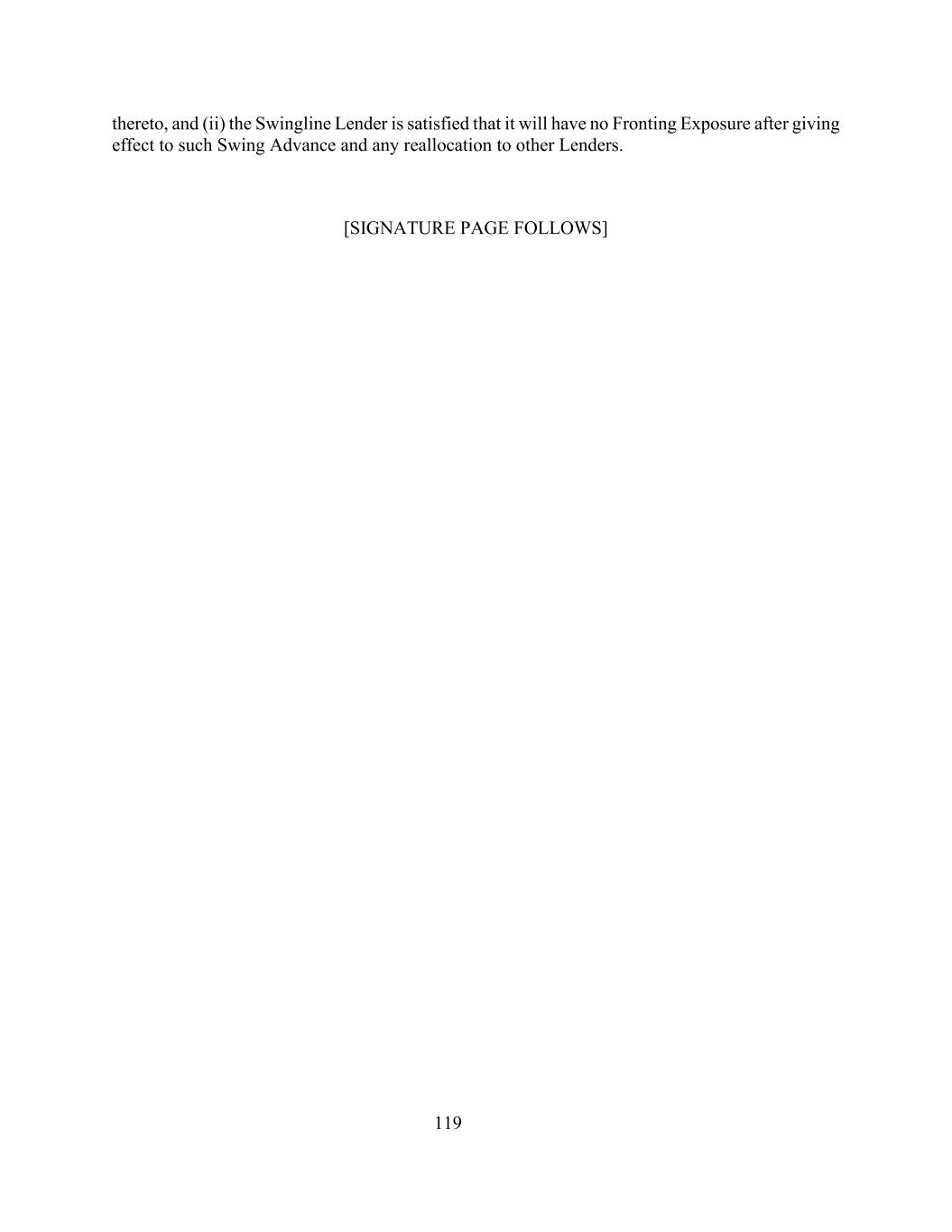 119,及(ii)Swingline贷款人信纳,在实施该周转垫款及任何重新分配予其他贷款人后,其将不会有正面风险。[签名页如下]