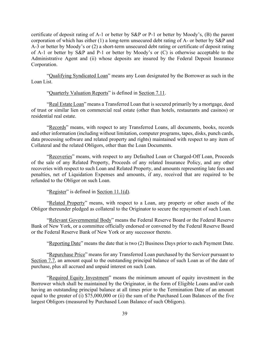 39存单评级被标普评为A-1或更高或被穆迪评为P-1或更高,(b)其母公司(1)长期无担保债务评级被标普评为A-或更高,被穆迪评为A-3或更高,或(2)短期无担保债务评级或存单评级被标普评为A-1或更高,被穆迪评为P-1或更高,或(c)否则行政代理人可接受,且(ii)其存款由联邦存款保险公司投保。“合格银团贷款”是指借款人在贷款清单中指定的任何贷款。“季度估值报告”在第7.11节中定义。“房地产贷款”是指主要以商业房地产(酒店、餐饮和赌场除外)或住宅房地产的抵押、信托契约或类似留置权为担保的转让贷款。“记录”是指,就任何已转让的贷款而言,除贷款文件外,就任何担保物项目和相关义务人保持的所有文件、簿册、记录和其他信息(包括但不限于计算机程序、磁带、磁盘、打孔卡、数据处理软件及相关财产和权利)。“追偿”是指,就任何违约贷款或核销贷款而言,出售任何相关财产的收益、任何相关保单的收益,以及与该贷款和相关财产有关的任何其他追偿,以及代表滞纳金和罚款的金额,扣除清算费用和收到的要求就该贷款向债务人退还的金额(如有)。“注册”在第11.1(d)节中定义。“相关财产”是指,就贷款而言,作为担保物质押给发起人以担保偿还该贷款的债务人的任何财产或其他资产。“相关政府机构”是指美国联邦储备委员会或纽约联邦储备银行,或由美国联邦储备委员会或纽约联邦储备银行或其任何继任者正式认可或召集的委员会。“报告日”是指每个付款日期前两(2)个工作日的日期。“回购价格”是指服务商根据第7.7条购买的任何已转让贷款,金额等于截至购买之日该贷款的未偿本金余额,加上该贷款的所有应计和未付利息。“所需股权投资”是指应由发起人维持的对借款人的最低股权投资金额,形式为符合条件的贷款和/或在终止日期之前所有时间均有未偿本金余额的现金,金额等于(i)75,000,000美元或(ii)五个最大债务人的已购买贷款余额之和(以这些债务人的已购买贷款余额衡量)中的较高者。