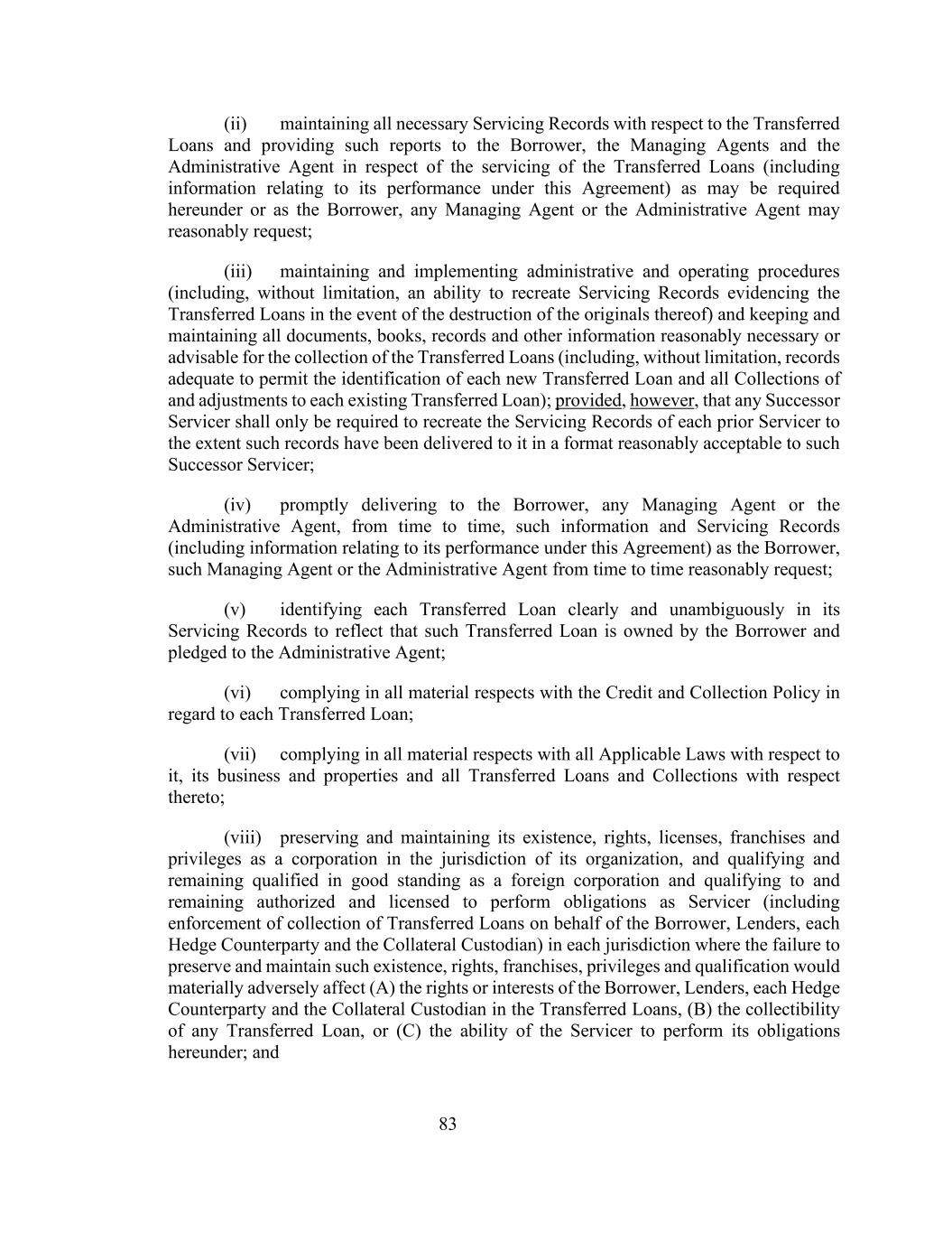 83(ii)就所转让的贷款维持所有必要的服务记录,并就所转让的贷款的服务向借款人、管理代理和行政代理提供本协议可能要求的报告(包括与其根据本协议履行有关的信息)或作为借款人、任何管理代理或行政代理合理要求的报告;(iii)维持和执行行政和操作程序(包括但不限于,有能力在已销毁已转让贷款原件的情况下重新创建证明已转让贷款的服务记录),并保存和维护为收集已转让贷款而合理必要或可取的所有文件、簿册、记录和其他信息(包括但不限于足以允许识别每笔新的已转让贷款以及每笔现有已转让贷款的所有收集和调整的记录);但是,前提是,任何继承服务人只须在该等记录已按该继承服务人合理可接受的格式交付予其的范围内,重新创建每名先前服务人的服务记录;(iv)迅速向借款人、任何管理代理人或行政代理人不时交付作为借款人的该等资料及服务记录(包括与其根据本协议履行有关的资料),该管理代理人或行政代理人不时提出合理要求;(v)在其服务记录中明确无误地指明每笔转让贷款,以反映该等转让贷款为借款人所有并质押给行政代理人;(vi)在所有重大方面遵守每笔转让贷款的信贷和催收政策;(vii)在所有重大方面遵守与其有关的所有适用法律、其业务和财产以及与其有关的所有转让贷款和收款;(viii)维护和维护其存在、权利、许可,作为公司在其组织管辖范围内的特许和特权,以及作为外国公司的资格和保持良好信誉的资格,以及作为服务人履行义务(包括代表借款人、贷款人、每个对冲对手方和抵押品托管人强制执行所转让贷款的收款)的资格和保持授权和许可)在每个司法管辖区,如果未能维护和维持此类存在、权利、特许、特权和资格将对(a)借款人、贷款人、每个对冲对手方和抵押品托管人在所转让贷款中的权利或利益产生重大不利影响,(b)任何转让贷款的可收回性,或(c)服务人履行其在本协议项下义务的能力;及