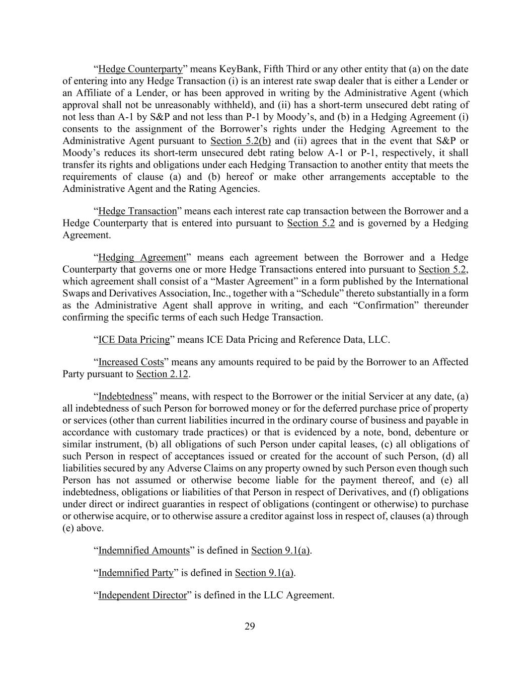 29“对冲交易对手”是指KeyBank、五三银行或任何其他实体,即(a)在进行任何对冲交易之日(i)是利率掉期交易商,该交易商要么是贷款人,要么是贷款人的关联公司,或已获得行政代理人的书面批准(不得无理拒绝批准),以及(ii)短期无担保债务评级不低于标普的A-1且不低于穆迪的P-1,和(b)在套期保值协议中(i)同意根据第5.2(b)和(ii)节将套期保值协议项下借款人的权利转让给行政代理人,同意在标普或穆迪分别将其短期无担保债务评级降至A-1或P-1以下的情况下,其应将其在每项套期保值交易下的权利和义务转让给符合本协议(a)和(b)条要求的另一实体,或作出行政代理人和评级机构可接受的其他安排。“对冲交易”是指借款人与对冲交易对手之间根据第5.2节订立并受对冲协议管辖的每笔利率上限交易。“对冲协议”是指借款人与对冲交易对手之间的每项协议,该协议管辖根据第5.2节订立的一项或多项对冲交易,该协议应包括国际掉期和衍生品协会(International Swaps and Derivatives Association,Inc.)公布的格式的“主协议”,连同其“附表”,其格式大致为行政代理人应以书面批准的形式,以及根据该协议确认每项此类对冲交易的具体条款的每份“确认书”。“ICE数据定价”是指ICE数据定价和参考数据有限责任公司。“增加的成本”是指借款人根据第2.12节要求向受影响方支付的任何金额。“负债”是指,就借款人或初始服务商而言,在任何日期,(a)该人因借款或财产或服务的递延购买价格(在正常业务过程中发生并根据习惯贸易惯例应付的流动负债除外)或由票据、债券、债权证或类似票据证明的全部债务,(b)该人在资本租赁下的所有义务,(c)该人就为该人的账户发行或创建的接受而承担的全部义务,(d)由该人所拥有的任何财产的任何不利债权担保的所有法律责任,即使该人并未承担或以其他方式成为偿付该财产的法律责任,及(e)该人就衍生工具的所有债务、义务或法律责任,及(f)根据直接或间接担保就购买或以其他方式取得的义务(或有或其他)承担的义务,或以其他方式向债权人保证就上述(a)至(e)条的损失。第9.1节(a)中对“赔偿金额”进行了定义。第9.1节(a)中对“受偿方”进行了定义。LLC协议中对“独立董事”进行了定义。