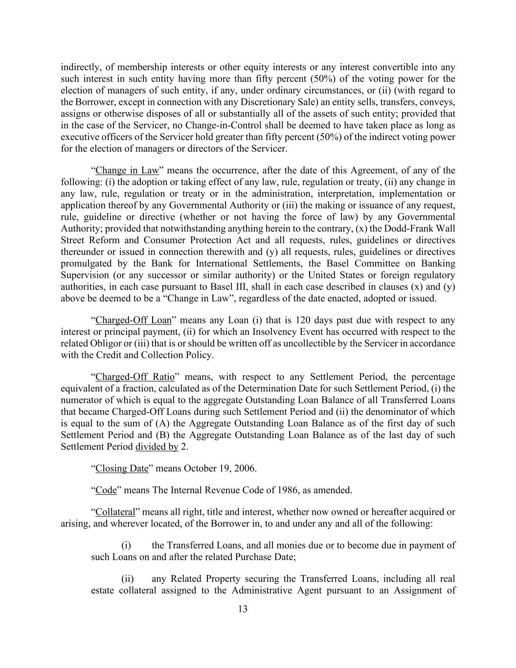 13间接地,会员权益或其他股权权益或可转换为该实体任何此类权益的任何权益,在一般情况下,该实体在选举该实体的经理(如有)时拥有超过百分之五十(50%)的投票权,或(ii)(就借款人而言,除与任何酌情出售有关外)一实体出售、转让、转让、转让或以其他方式处置该实体的全部或基本全部资产;但就服务商而言,只要服务商的执行官在选举服务商的经理或董事方面拥有超过百分之五十(50%)的间接投票权,就不应被视为发生了控制权变更。“法律变更”是指在本协定日期之后发生以下任何情况:(i)任何法律、规则、条例或条约的通过或生效,(ii)任何法律、规则、条例或条约的任何变更或任何政府当局对其行政、解释、实施或适用的任何变更,或(iii)任何政府当局提出或发出任何请求、规则、准则或指令(无论是否具有法律效力);条件是,尽管本协定有任何相反的规定,(x)《多德-弗兰克华尔街改革和消费者保护法》及其下或与之相关发布的所有请求、规则、指南或指令,以及(y)国际清算银行、巴塞尔银行监管委员会(或任何后续或类似机构)或美国或外国监管机构发布的所有请求、规则、指南或指令,在每种情况下均应根据巴塞尔协议III,在上述(x)和(y)条所述的每种情况下均应被视为“法律变更”,无论颁布、通过或发布的日期如何。“已注销贷款”是指任何贷款(i)就任何利息或本金支付逾期120天,(ii)已就相关债务人发生破产事件,或(iii)已或应根据信贷和催收政策被注销为无法由服务商收回。“核销比例”是指,就任何结算期而言,截至该结算期的确定日期计算的零头的百分比等值,(i)其分子等于在该结算期内成为核销贷款的所有转让贷款的未偿还贷款余额总额,以及(ii)其分母等于(a)截至该结算期第一天的未偿还贷款余额总额和(b)截至该结算期最后一天的未偿还贷款余额总额除以2的总和。“截止日”是指2006年10月19日。“法典”是指经修订的1986年《国内税收法典》。“抵押品”是指借款人在以下任何和所有情况下、在以下情况下以及在以下情况下获得或产生的所有权利、所有权和利息,无论是现在拥有的还是以后产生的,以及位于何处:(i)转让的贷款,以及在相关购买日期及之后支付此类贷款的所有到期或将要到期的款项;(ii)为转让贷款提供担保的任何相关财产,包括根据转让转让给行政代理人的所有房地产抵押品