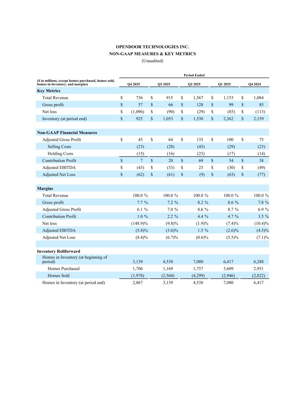 OpenDOOR TECHNOLOGIES INC。非公认会计准则计量和关键指标(未经审计)期末(百万美元,购买的房屋、出售的房屋、库存中的房屋除外,和利润率)2025年第四季度、2025年第三季度、2025年第二季度、2025年第一季度、2024年第四季度关键指标总收入736美元915美元1567美元1153美元1084美元毛利润57美元66美元128美元99美元85美元净亏损(1096)美元(90)美元(29)美元(85)美元(113)存货(期末)925美元1053美元1530美元2362美元2159美元非公认会计准则财务指标调整后毛利润45美元64美元135美元100美元75美元销售成本(23)(28)(43)(29)(23)持有成本(15)(16)(23)(17)(14)贡献利润7美元20美元$ 69 $ 54 $ 38调整后EBITDA $(43)$(33)$ 23 $(30)$(49)调整后净亏损$(62)$(61)$(9)$(63)$(77)利润率总收入100.0% 100.0% 100.0% 100.0% 100.0%毛利7.7% 7.2% 8.2% 8.6% 7.8%调整后毛利6.1% 7.0% 8.6% 6.9%贡献利润1.0% 2.2% 4.4% 4.7% 3.5%净亏损(148.9)%(9.8)%(1.9)%(7.4)%(10.4)%调整后EBITDA(5.8)%(3.6)%1.5%(2.6)%(4.5)%调整后净亏损(8.4)%(6.7)%(0.6)%(5.5)%(7.1)%存货滚存存货中房屋(期初)3,1394,5387,0806,4176,288所购房屋1,7061,1691,7573,6092,951所售房屋(1,978)(2,568)(4,299)(2,946)(2,822)存货中房屋(期末)2,8673,1394,5387,0806,417