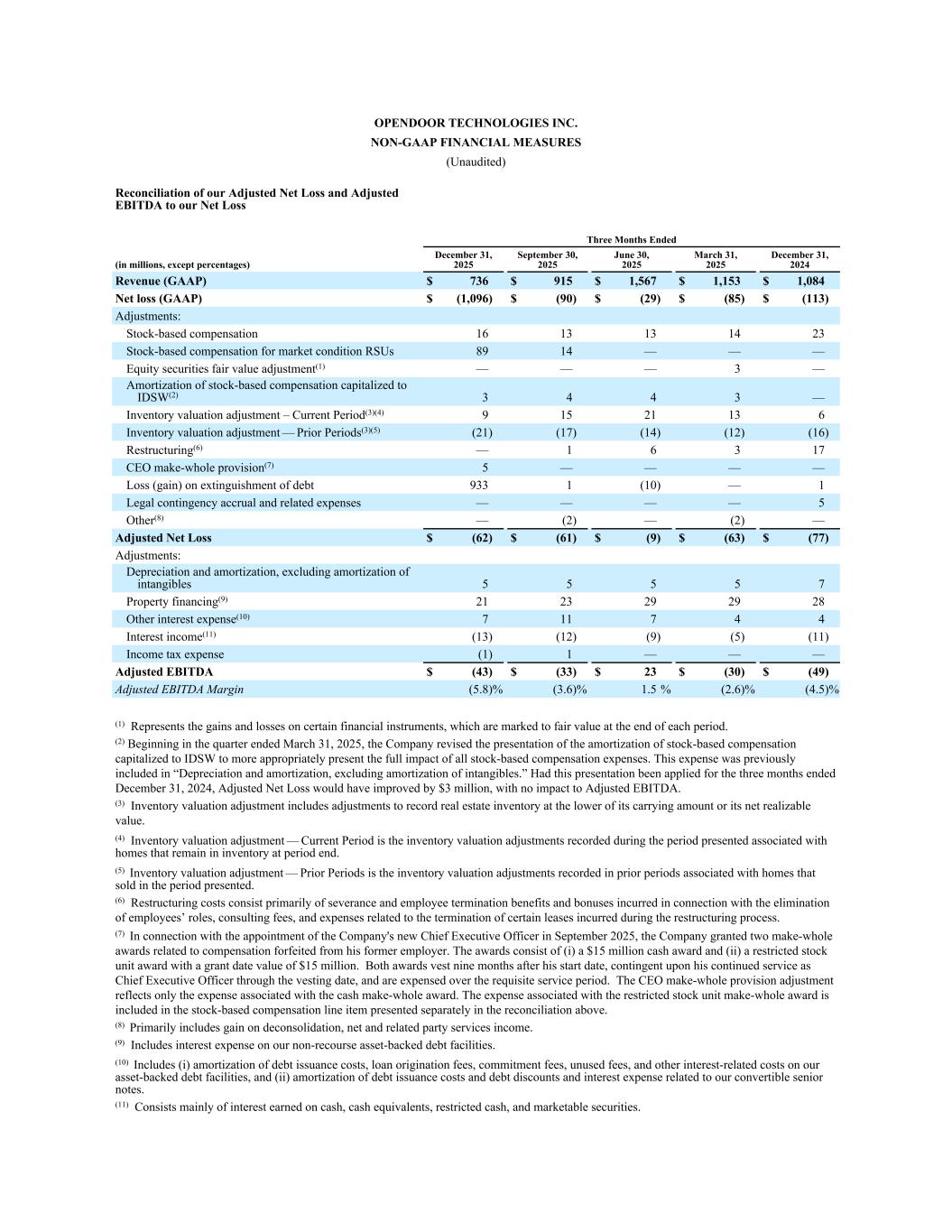 OpenDOOR TECHNOLOGIES INC。非公认会计准则财务措施(未经审计)调整后净亏损和调整后EBITDA与截至三个月净亏损的对账(以百万计,百分比除外)2025年12月31日2025年9月30日2025年6月30日2025年3月31日2025年12月31日,2024年收入(GAAP)736美元915美元1567美元1153美元1084美元净亏损(GAAP)美元(1096)美元(90)美元(29)美元(85)美元(113)调整:股票薪酬1613131423股票薪酬市场条件RSU 8914 ————权益证券公允价值调整(1)———— 3 ——以股票为基础的补偿摊销资本化至IDSW(2)3443 ——存货估值调整–本期(3)(4)91521136存货估值调整—前期(3)(5)(21)(17)(14)(12)(16)重组(6)— 16317 CEO整备准备(7)5————债务清偿损失(收益)9331(10)— 1法定或有事项应计及相关费用———— 5其他(8)——(2)——(2)——调整后净亏损$(62)$(61)$(9)$(63)$(77)调整:折旧和摊销,不包括无形资产摊销55557物业融资(9)2123292928其他利息费用(10)711744利息收入(11)(13)(12)(9)(5)(11)所得税费用(1)1 ——调整后EBITDA $(43)$(33)$ 23 $(30)$(49)调整后EBITDA利润率(5.8)%(3.6)% 1.5%(2.6)%(4.5)%(1)表示某些金融工具的损益,在每个期末以公允价值计量。(2)从截至2025年3月31日的季度开始,公司修改了向IDSW资本化的股票薪酬摊销的列报方式,以更恰当地列报所有股票薪酬费用的全部影响。这笔费用此前被列入“折旧和摊销,不包括无形资产摊销”。如果对截至2024年12月31日的三个月采用这一表述,调整后的净亏损将改善300万美元,对调整后的EBITDA没有影响。(三)存货计价调整包括按账面价值或可变现净值孰低计入房地产存货的调整。(4)存货估值调整——本期是与期末仍在存货中的房屋相关的列报期间记录的存货估值调整。(5)存货估价调整——前期是指与所列期间已售出的房屋相关的前期记录的存货估价调整。(6)重组成本主要包括与消除员工角色相关的遣散费和员工解雇福利和奖金、咨询费以及重组过程中与终止某些租约相关的费用。(7)就于2025年9月委任公司新任行政总裁而言,公司授出两项与从其前雇主处没收的补偿有关的整体补偿奖励。奖励包括(i)1500万美元的现金奖励和(ii)授予日价值为1500万美元的限制性股票单位奖励。这两项奖励在他的开始日期后九个月归属,取决于他在归属日期之前是否继续担任首席执行官,并在必要的服务期内计入费用。CEO整补拨备调整仅反映与现金整补奖励相关的费用。与限制性股票单位整补奖励相关的费用包含在上述调节中单独列示的基于股票的补偿项目中。(8)主要包括分拆收益、净额和关联方服务收入。(9)包括我们的无追索权资产担保债务融资的利息支出。(10)包括(i)债务发行成本、贷款发起费、承诺费、未使用费用以及我们的资产担保债务融资的其他利息相关成本的摊销,以及(ii)债务发行成本以及与我们的可转换优先票据相关的债务折扣和利息费用的摊销。(11)主要包括现金、现金等价物、限制性现金、有价证券所赚取的利息。
