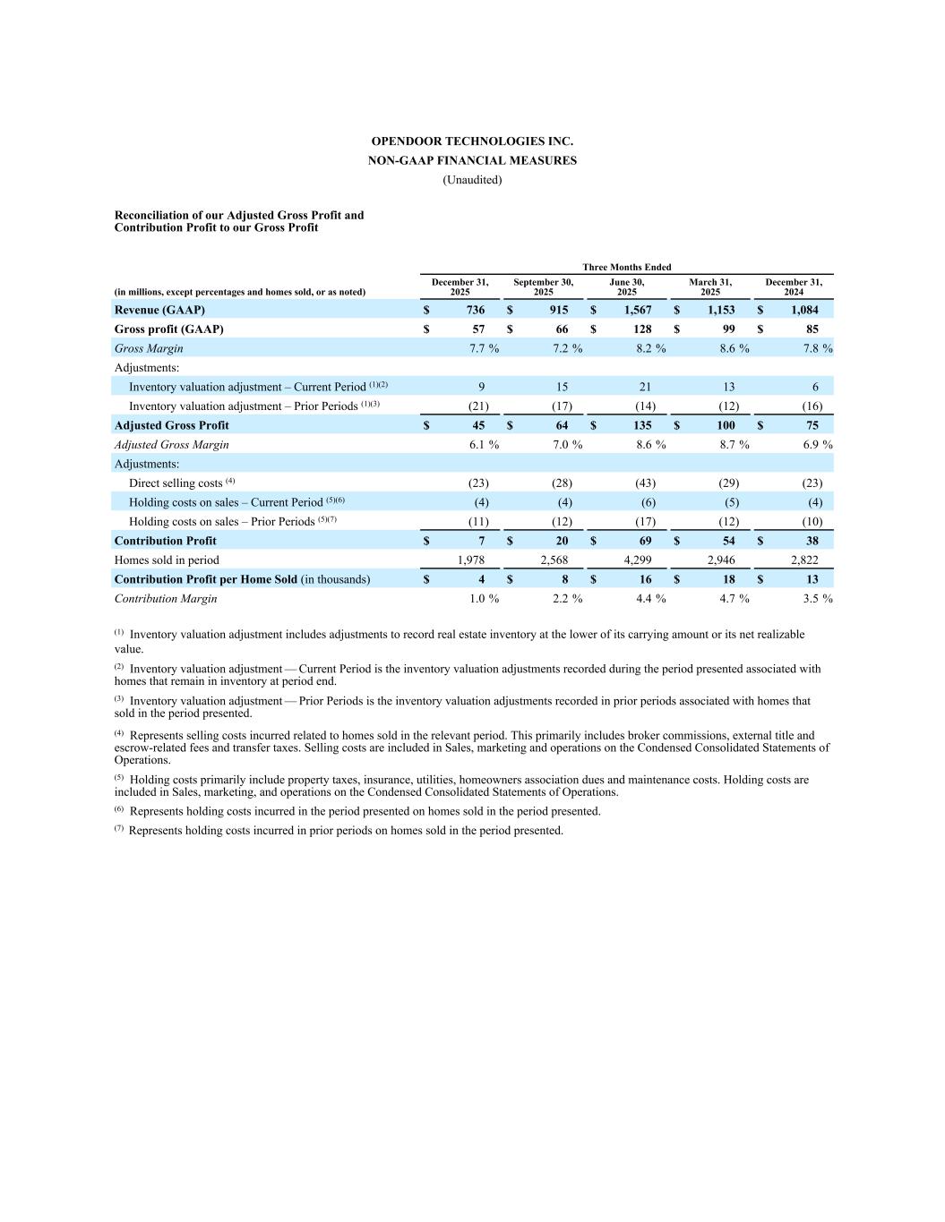 OpenDOOR TECHNOLOGIES INC。非公认会计准则财务措施(未经审计)调整后毛利润和贡献利润与截至三个月的毛利润的对账(以百万计,百分比和已售房屋除外,或如注)2025年12月31日2025年9月30日2025年6月30日2025年3月31日2025年12月31日,2024年收入(GAAP)736美元915美元1567美元1153美元1084美元毛利润(GAAP)57美元66美元128美元99美元85美元毛利率7.7% 7.2% 8.2% 8.6% 7.8%调整:存货估值调整–本期(1)(2)91521136存货估值调整–前期(1)(3)(21)(17)(14)(12)(16)调整后毛利45美元64美元135美元100美元75美元调整后毛利率6.1% 7.0% 8.6% 8.7% 6.9%调整:直销成本(4)(23)(28)(43)(29)(23)持有销售成本–本期(5)(6)(4)(4)(6)(5)(4)销售持有成本–前期(5)(7)(11)(12)(17)(12)(10)贡献利润$ 7 $ 20 $ 69 $ 54 $ 38期间出售的房屋1,9782,5684,2992,9462,822每出售一所房屋的贡献利润(以千美元计)$ 4 $ 8 $ 16 $ 18 $ 13贡献利润率1.0% 2.2% 4.4% 4.7% 3.5%(1)存货估值调整包括按账面价值或其可变现净值中较低者记录不动产存货的调整。(2)存货估值调整——本期是与期末仍在存货中的房屋相关的列报期间记录的存货估值调整。(3)存货估价调整——前期是指在前期记录的与所列期间内出售的房屋相关的存货估价调整。(4)指与有关期间出售的房屋有关的销售成本。这主要包括经纪人佣金、外部所有权和托管相关费用以及转让税。销售成本包含在简明综合经营报表的销售、营销和运营中。(5)持有成本主要包括物业税、保险、水电费、业主协会会费和维护成本。持有成本包含在简明合并运营报表的销售、营销和运营中。(6)表示在呈列期间出售的房屋在呈列期间发生的持有成本。(7)表示在列报期间出售的房屋在以往期间发生的持有成本。