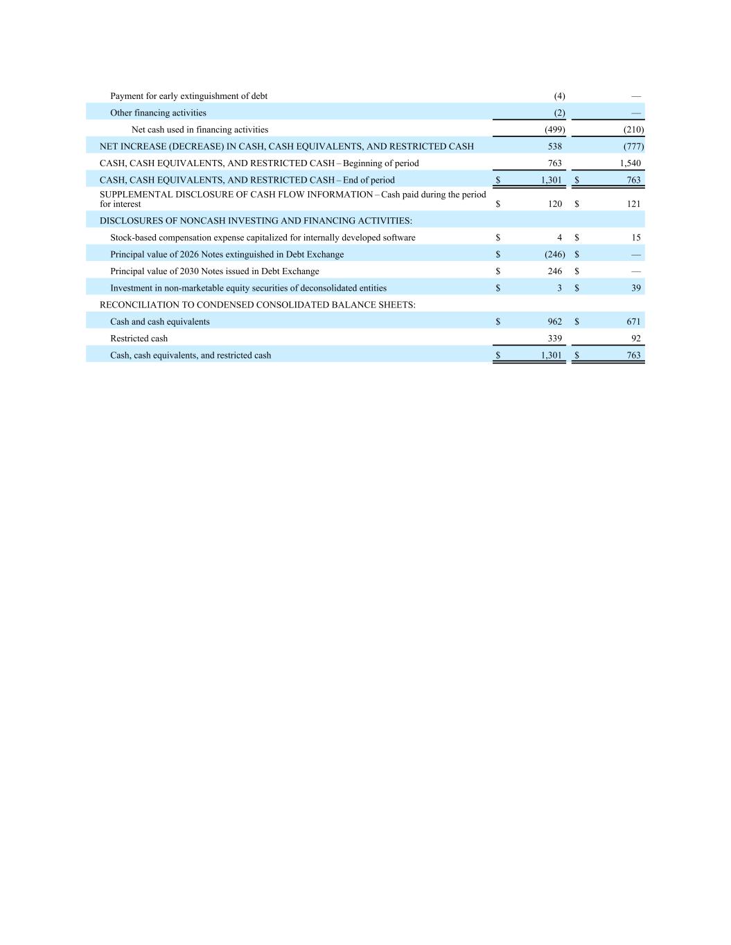 提前清偿债务的支付(4)—其他筹资活动(2)—筹资活动使用的现金净额(499)(210)现金、现金等价物、受限现金净增(减)额538(777)现金、现金等价物、受限现金–期初7631,540现金、现金等价物、和受限现金–期末1301美元763美元现金流信息的补充披露–期间支付的利息现金120美元121美元非现金投资和融资活动的披露:为内部开发的软件资本化的基于股票的补偿费用4美元15美元2026年债务交换中到期票据的本金价值$(246)$ —债务交换中发行的2030年票据的本金价值246美元—对非合并实体的非流通股本证券的投资3美元39美元与简明合并资产负债表的对账:现金和现金等价物$ 962 $ 671受限制现金33992现金、现金等价物和受限制现金$ 1,301 $ 763