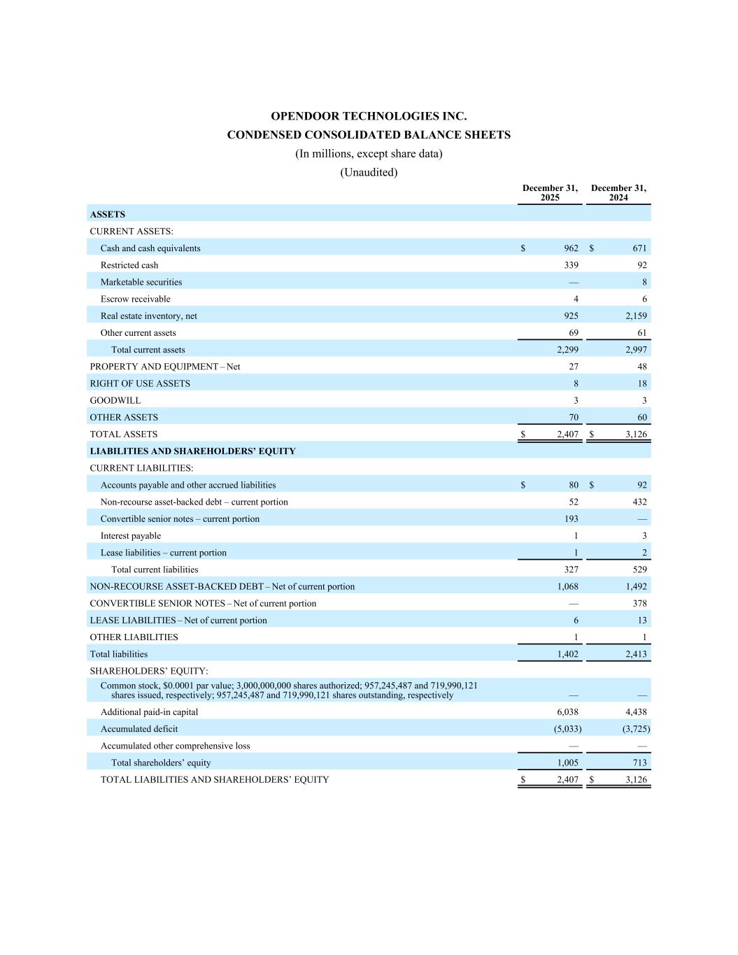 OpenDOOR TECHNOLOGIES INC。简明合并资产负债表(百万,股份数据除外)(未经审计)2025年12月31日2024年12月31日资产流动资产:现金及现金等价物962美元671美元受限制现金33992有价证券— 8应收代管款项46房地产存货,净额9252,159其他流动资产6961流动资产总额2,2992,997财产和设备–净额2748使用权资产818商誉33其他资产7060资产总额2,407美元3,126美元负债和股东权益流动负债:应付账款和其他应计负债80美元92美元无追索权资产支持债务–流动部分52432可转换优先票据–流动部分193 —应付利息13租赁负债–流动部分12流动负债总额327529非经常性资产支持债务–扣除流动部分1,0681,492可转换优先票据–扣除流动部分— 378租赁负债–扣除流动部分613其他负债11负债总额1,4022,413股股东权益:普通股,面值0.0001美元;授权3,000,000,000股;已发行股份分别为957,245,487股和719,990,121股;已发行股份957,245,487股和719,990,121股,分别—— 额外实收资本 6,0384,438累计亏损(5,033)(3,725)累计其他综合亏损——股东权益合计1,005713负债总额和股东权益$ 2,407 $ 3,126