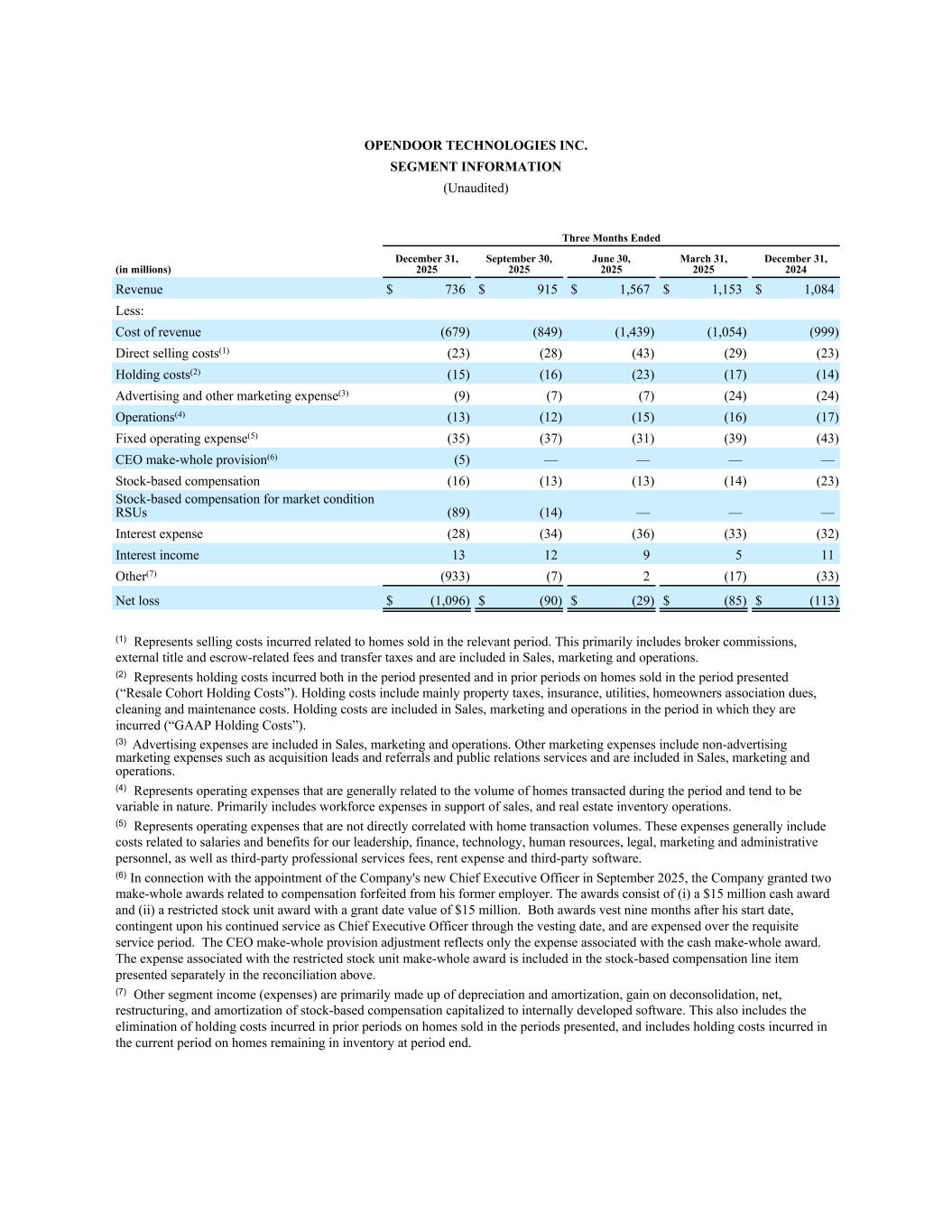 OpenDOOR TECHNOLOGIES INC。分部信息(未经审计)截至三个月(百万)2025年12月31日2025年9月30日2025年6月30日2025年3月31日2025年12月31日,2024年收入736美元915美元1567美元1153美元1084美元减:收入成本(679)(849)(1439)(1054)(999)直销成本(1)(23)(28)(43)(29)(23)持有成本(2)(15)(16)(23)(17)(14)广告和其他营销费用(3)(9)(7)(7)(24)(24)运营(4)(13)(12)(15)(16)(17)固定运营费用(5)(35)(37)(31)(39)(43)CEO补足准备(6)(5)————基于股票的薪酬(16)(13)(13)(14)(23)基于股票的市场条件RSU(89)(14)————利息费用(28)(34)(36)(33)(32)利息收入13129511其他(7)(933)(7)2(17)(33)净亏损$(1,096)$(90)$(29)$(85)$(113)(1)指与相关期间出售的房屋相关的销售成本。这主要包括经纪人佣金、外部所有权和托管相关费用以及转让税,并包含在销售、营销和运营中。(2)表示在呈报期间和以往期间对呈报期间出售的房屋产生的持有成本(“转售群组持有成本”)。持有成本主要包括物业税、保险、水电费、业主协会会费、清洁和维护成本。持有成本在发生期间计入销售、营销和运营(“GAAP持有成本”)。(3)广告费用计入销售、营销和运营。其他营销费用包括收购线索和推荐以及公关服务等非广告营销费用,并计入销售、营销和运营。(4)表示一般与该期间成交的房屋数量有关,且在性质上趋于可变的运营费用。主要包括支持销售的劳动力支出,以及房地产库存运营。(5)表示与房屋交易量没有直接关联的运营费用。这些费用一般包括与我们的领导层、财务、技术、人力资源、法律、营销和行政人员的工资和福利相关的成本,以及第三方专业服务费用、租金费用和第三方软件。(6)就于2025年9月委任公司新任行政总裁而言,公司授出两项与从其前雇主处没收的补偿有关的整体补偿奖励。奖励包括(i)1500万美元的现金奖励和(ii)授予日价值为1500万美元的限制性股票单位奖励。这两项奖励在他的开始日期后九个月归属,取决于他在归属日期之前是否继续担任首席执行官,并在必要的服务期内计入费用。CEO make-whole拨备调整仅反映与现金make-whole奖励相关的费用。与限制性股票单位整包奖励相关的费用包含在上述调节中单独列示的基于股票的补偿项目中。(7)其他分部收入(费用)主要由折旧和摊销、分拆收益、净额、重组、以及资本化到内部开发软件的股票补偿摊销组成。这还包括消除在列报期间出售的房屋在前几个期间产生的持有成本,并包括在本期间对期末仍在库存中的房屋产生的持有成本。