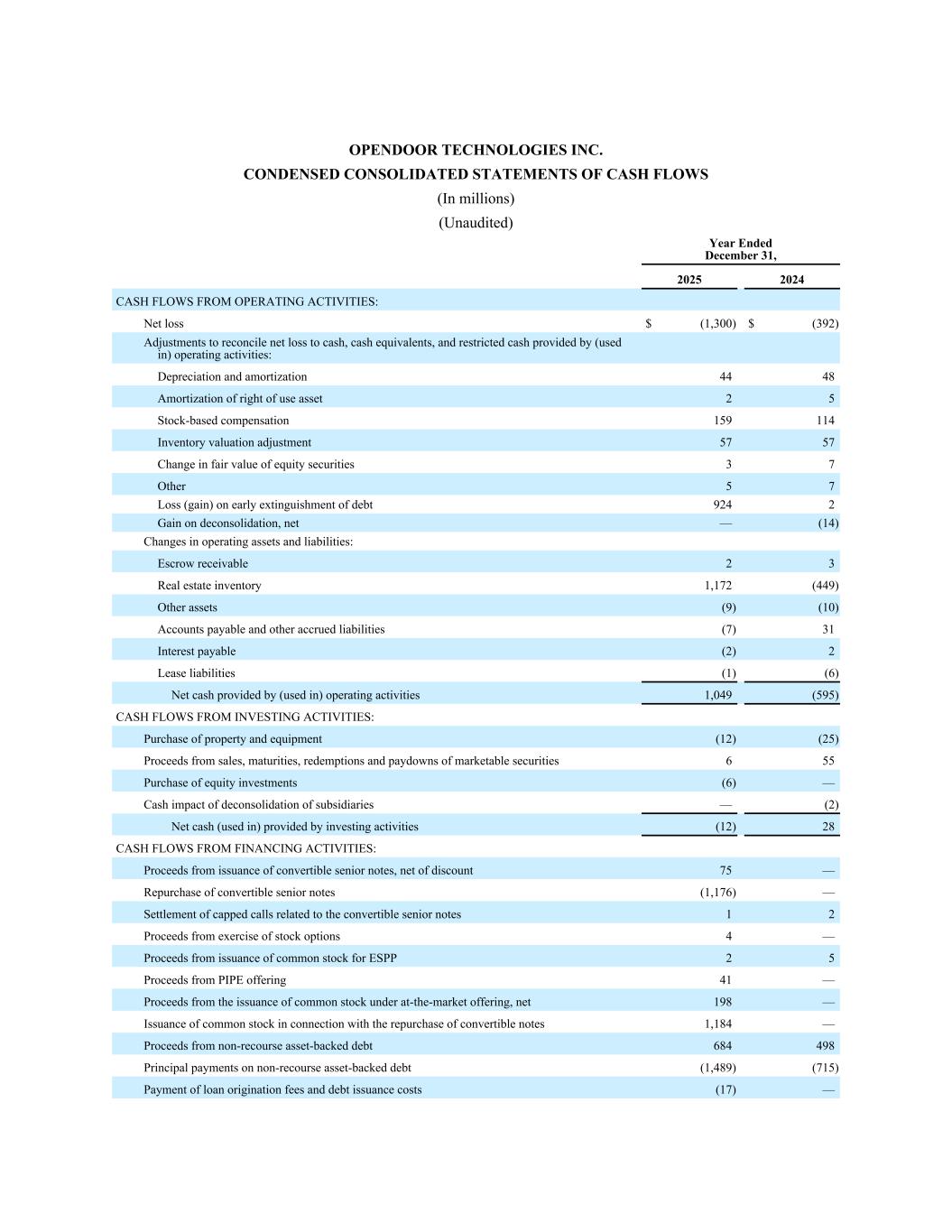 OpenDOOR TECHNOLOGIES INC。简明合并现金流量表(百万)(未经审计)截至2025年12月31日止年度2024年经营活动现金流量:净亏损$(1,300)$(392)调整净亏损与现金、现金等价物和经营活动提供(用于)的受限现金:折旧和摊销4448使用权资产摊销25以股票为基础的补偿159114存货估值调整5757权益类证券公允价值变动37其他57债务提前清偿损失(收益)9242分拆收益,净额—(14)经营性资产和负债变动:应收托管款项23房地产存货1,172(449)其他资产(9)(10)应付账款和其他应计负债(7)31应付利息(2)2租赁负债(1)(6)经营活动提供(用于)的现金净额1,049(595)投资活动产生的现金流量:购买物业和设备(12)(25)销售所得款项,到期,有价证券的赎回和偿还655购买股权投资(6)—分拆子公司的现金影响—(2)投资活动提供的(用于)现金净额(12)28融资活动产生的现金流量:发行可转换优先票据所得款项,折让净额75 —回购可转换优先票据(1,176)—与可转换优先票据相关的有上限追缴款的结算12行使股票期权的收益4 — ESPP发行普通股的收益25 PIPE发行的收益41 —根据市场发售发行普通股的收益,净额198 —与回购可转换票据有关的普通股发行1,184 —无追索权资产支持债务的收益684498无追索权资产支持债务的本金支付(1,489)(715)支付贷款发起费和债务发行费用(17)—