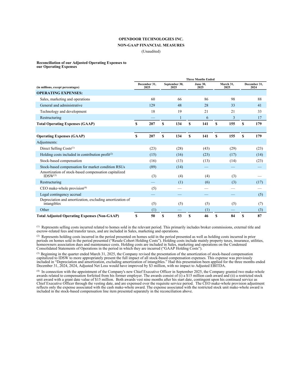 OpenDOOR TECHNOLOGIES INC。非公认会计准则财务措施(未经审计)我们调整后的运营费用与截至三个月的运营费用的对账(以百万计,百分比除外)2025年12月31日2025年9月30日2025年6月30日2025年3月31日2025年12月31日2024年12月31日运营费用:销售额,营销和运营6066869888一般和行政12948283341技术和发展1819212133重组— 16317总运营费用(GAAP)207美元134美元141美元155美元179美元运营费用(GAAP)207美元134美元141美元155美元179美元调整:Direct Selling成本(1)(23)(28)(43)(29)(23)计入贡献利润的持有成本(2)(15)(16)(23)(17)(14)股票薪酬(16)(13)(14)(23)股票薪酬针对市场条件的RSU(89)(14)————以股票为基础的薪酬资本化IDSW的摊销(3)(3)(4)(3)——重组——(1)(6)(3)(17)CEO整备准备(4)(5)————法律或有事项应计————(5)折旧和摊销,不包括无形资产摊销(5)(5)(5)(7)其他(1)——(1)——(3)调整后运营费用总额(非美国通用会计准则)50美元53美元46美元84美元87美元(1)代表与相关期间出售的房屋相关的销售成本。这主要包括经纪人佣金、外部所有权和托管相关费用以及转让税,并包含在销售、营销和运营中。(2)表示在呈列期间内出售的房屋在呈列期间发生的持有成本以及在呈列期间内出售的房屋在以往期间发生的持有成本(“转售队列持有成本”)。持有成本主要包括物业税、保险、水电费、房主协会会费和维护成本。持有成本包含在发生期间的简明合并运营报表的销售、营销和运营中(“GAAP持有成本”)。(3)从截至2025年3月31日的季度开始,公司修改了向IDSW资本化的股票薪酬摊销的列报方式,以更恰当地列报所有股票薪酬费用的全部影响。这笔费用此前被列入“折旧和摊销,不包括无形资产摊销”。如果对截至2024年12月31日和2024年12月31日的三个月采用这种列报方式,调整后的净亏损将改善300万美元,对调整后的EBITDA没有影响。(4)就于2025年9月委任公司新任行政总裁而言,公司授出两项与从其前雇主处没收的补偿有关的整体补偿奖励。奖励包括(i)1500万美元的现金奖励和(ii)授予日价值为1500万美元的限制性股票单位奖励。这两项奖励在他的开始日期后九个月归属,取决于他在归属日期之前是否继续担任首席执行官,并在必要的服务期内计入费用。CEO make-whole拨备调整仅反映与现金make-whole奖励相关的费用。与限制性股票单位整补奖励相关的费用包含在上述调节中单独列示的基于股票的补偿项目中。