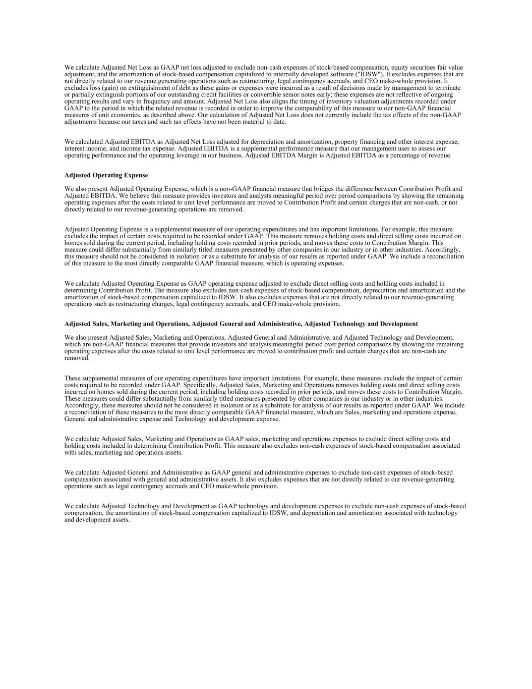 我们将调整后的净亏损计算为调整后的GAAP净亏损,以排除基于股票的薪酬、权益证券公允价值调整的非现金费用以及资本化到内部开发软件(“IDSW”)的基于股票的薪酬的摊销。它不包括与我们的创收业务没有直接关系的费用,例如重组、法律应急应计费用和CEO整编准备金。它不包括债务清偿的损失(收益),因为这些收益或费用是由于管理层决定提前终止或部分消灭我们未偿还的信贷融资或可转换优先票据的部分而产生的;这些费用不反映持续的经营业绩,并且在频率和金额上各不相同。调整后的净亏损还使根据GAAP记录的存货估值调整的时间与相关收入记录的期间保持一致,以提高这一衡量标准与我们的非GAAP单位经济财务衡量标准的可比性,如上所述。我们对调整后净亏损的计算目前不包括非公认会计原则调整的税收影响,因为迄今为止我们的税收和此类税收影响并不重要。我们将调整后的EBITDA计算为调整后的净亏损,调整后的折旧和摊销、物业融资和其他利息费用、利息收入和所得税费用。调整后EBITDA是一种补充业绩衡量标准,我们的管理层用来评估我们的经营业绩和我们业务中的经营杠杆。调整后EBITDA利润率是调整后EBITDA占收入的百分比。调整后的运营费用我们还提出了调整后的运营费用,这是一种非GAAP财务指标,用于弥补贡献利润和调整后EBITDA之间的差异。我们认为,这一衡量标准通过显示与单位层面绩效相关的成本移至贡献利润和某些非现金或与我们的创收业务没有直接关系的费用后的剩余运营费用,为投资者和分析师提供了有意义的期间比较。调整后的运营费用是对我们运营支出的补充衡量,具有重要的局限性。例如,这一衡量标准排除了需要在GAAP下记录的某些成本的影响。这一措施去除了持有成本和当期出售房屋产生的直接销售成本,包括前期记录的持有成本,并将这些成本移至贡献保证金。这项措施可能与我们行业或其他行业的其他公司提出的类似标题的措施有很大不同。因此,不应孤立地考虑这一衡量标准,也不应替代根据公认会计原则报告的对我们结果的分析。我们将这一衡量标准与最直接可比的GAAP财务衡量标准——运营费用——进行了对账。我们将调整后的运营费用计算为调整后的GAAP运营费用,以排除在确定贡献利润中包含的直销成本和持有成本。该措施还不包括基于股票的薪酬、折旧和摊销的非现金费用,以及资本化为IDSW的基于股票的薪酬的摊销。它还不包括与我们的创收业务没有直接关系的费用,例如重组费用、法律应急应计费用和CEO整编准备金。调整后的销售、营销和运营、调整后的一般和行政、调整后的技术和发展我们还提出了调整后的销售、营销和运营、调整后的一般和行政以及调整后的技术和发展,这是非公认会计准则财务指标,通过显示与单位层面业绩相关的成本移至贡献利润和某些非现金费用后的剩余运营费用,为投资者和分析师提供有意义的期间比较。我们运营支出的这些补充措施有重要的局限性。例如,这些措施排除了要求在GAAP下记录的某些成本的影响。具体而言,调整后的销售、营销和运营剔除了当期出售房屋产生的持有成本和直销成本,包括前期记录的持有成本,并将这些成本移至贡献利润率。这些措施可能与我们行业或其他行业的其他公司提出的类似标题的措施有很大不同。因此,不应孤立地考虑这些措施,也不应替代根据公认会计原则报告的对我们结果的分析。我们将这些指标与最直接可比的GAAP财务指标进行了对账,这些指标是销售、营销和运营费用, 一般和行政费用以及技术和开发费用。我们将调整后的销售、营销和运营计算为GAAP销售、营销和运营费用,以排除在确定贡献利润中包含的直销成本和持有成本。该措施还不包括与销售、营销和运营资产相关的基于股票的薪酬的非现金费用。我们将调整后的一般和行政费用计算为GAAP一般和行政费用,以排除与一般和行政资产相关的基于股票的薪酬的非现金费用。它还不包括与我们的创收业务没有直接关系的费用,例如法律应急应计费用和CEO补足准备金。我们将调整后的技术和开发计算为GAAP技术和开发费用,以排除基于股票的薪酬的非现金费用、资本化为IDSW的基于股票的薪酬的摊销以及与技术和开发资产相关的折旧和摊销。