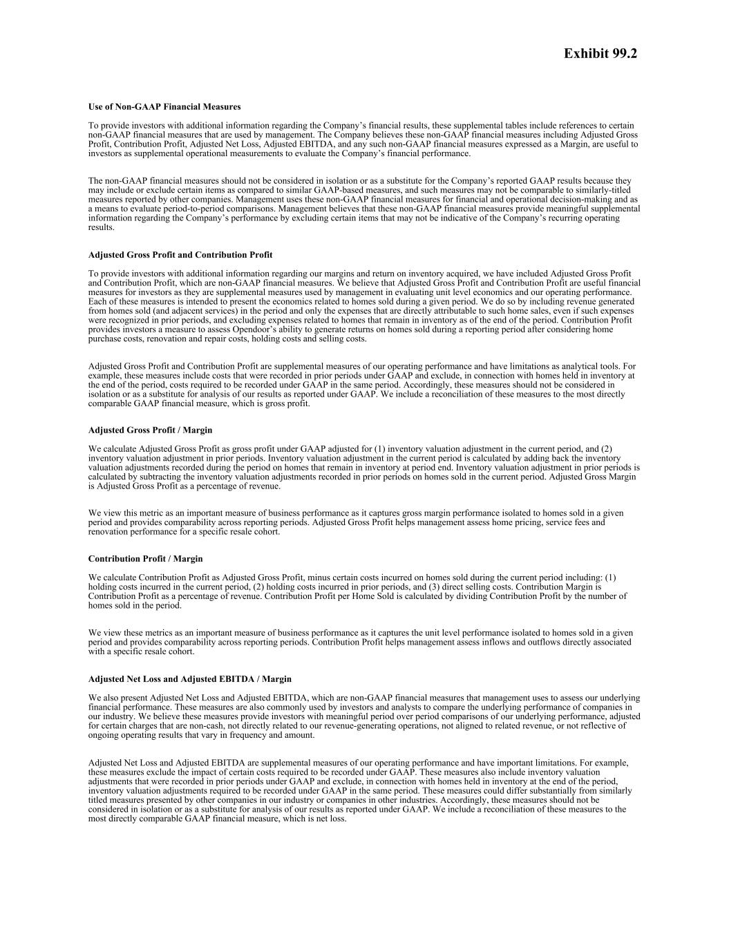 使用非公认会计准则财务指标向投资者提供有关公司财务业绩的更多信息,这些补充表格包括对管理层使用的某些非公认会计准则财务指标的引用。该公司认为,这些非GAAP财务指标,包括调整后的毛利润、贡献利润、调整后的净亏损、调整后的EBITDA,以及以保证金表示的任何此类非GAAP财务指标,对投资者有用,可作为评估公司财务业绩的补充运营衡量标准。非GAAP财务指标不应被孤立地考虑或作为公司报告的GAAP结果的替代品,因为与类似的基于GAAP的指标相比,它们可能包括或排除某些项目,并且此类指标可能无法与其他公司报告的类似标题的指标进行比较。管理层将这些非公认会计准则财务指标用于财务和运营决策,并作为评估期间比较的一种手段。管理层认为,这些非公认会计准则财务指标通过排除某些可能不代表公司经常性经营业绩的项目,提供了有关公司业绩的有意义的补充信息。调整后的毛利润和贡献利润为了向投资者提供有关我们的利润率和获得的库存回报率的更多信息,我们将调整后的毛利润和贡献利润包括在内,这是非公认会计准则财务指标。我们认为,调整后的毛利润和贡献利润对投资者来说是有用的财务指标,因为它们是管理层在评估单位层面的经济性和我们的经营业绩时使用的补充措施。这些措施中的每一项都旨在呈现与特定时期内出售的房屋相关的经济情况。我们这样做的方式是,包括该期间出售的房屋(和相邻服务)产生的收入,并且仅包括直接归属于此类房屋销售的费用,即使此类费用已在前期确认,并且不包括与截至期末仍在库存中的房屋相关的费用。Contribution Profit为投资者提供了一种衡量标准,可以在考虑购房成本、翻新和维修成本、持有成本和销售成本后,评估Opendoor在报告期内所售房屋产生回报的能力。调整后的毛利润和贡献利润是我们经营业绩的补充衡量标准,作为分析工具存在局限性。例如,这些衡量标准包括根据公认会计原则在以往各期记录的成本,并且不包括与期末库存中持有的房屋有关的同期要求在公认会计原则下记录的成本。因此,不应孤立地考虑这些措施,也不应替代根据公认会计原则报告的对我们结果的分析。我们将这些指标与最直接可比的GAAP财务指标——毛利润——进行了对账。调整后的毛利润/利润率我们将调整后的毛利润计算为根据(1)本期存货估值调整和(2)前期存货估值调整调整的GAAP下的毛利润。本期库存估值调整的计算方法是将期末仍在库存中的房屋在本期记录的库存估值调整加回。前期库存估值调整的计算方法是减去前期记录的本期已售房屋的库存估值调整。调整后的毛利率是调整后的毛利润占收入的百分比。我们将这一指标视为衡量业务表现的重要指标,因为它捕捉到了与特定时期内售出的房屋隔离的毛利率表现,并提供了各报告期的可比性。调整后的毛利润有助于管理层评估特定转售群体的房屋定价、服务费和装修业绩。贡献利润/利润率我们将贡献利润计算为调整后的毛利润,减去当期出售房屋产生的某些成本,包括:(1)当期产生的持有成本,(2)前期产生的持有成本,以及(3)直销成本。贡献利润率是贡献利润占收入的百分比。每售出一套房屋的贡献利润是通过贡献利润除以该期间售出的房屋数量计算得出的。我们将这些指标视为衡量业务绩效的重要指标,因为它捕捉到了与特定时期内出售的房屋隔离的单位级别绩效,并提供了各报告期的可比性。Contribution Profit帮助管理层评估与特定转售群组直接相关的流入和流出。调整后净亏损和调整后EBITDA/利润率我们还提出了调整后净亏损和调整后EBITDA, 这是管理层用来评估我们基本财务业绩的非公认会计准则财务指标。这些衡量指标也是投资者和分析师常用来比较我们行业内公司的基础表现的方法。我们认为,这些措施为投资者提供了对我们基本业绩的有意义的期间比较,调整了某些非现金、与我们的创收业务不直接相关、与相关收入不一致或不反映频率和金额不同的持续经营业绩的费用。调整后的净亏损和调整后的EBITDA是我们经营业绩的补充衡量标准,具有重要的局限性。例如,这些措施排除了需要在GAAP下记录的某些成本的影响。这些措施还包括根据公认会计原则在以往各期记录的库存估值调整,并排除了与期末库存中持有的房屋有关的同期根据公认会计原则需要记录的库存估值调整。这些措施可能与我们行业的其他公司或其他行业的公司提出的类似标题的措施有很大不同。因此,不应孤立地考虑这些措施,也不应替代根据公认会计原则报告的对我们结果的分析。我们将这些指标与最直接可比的GAAP财务指标——净亏损——进行了对账。附件 99.2