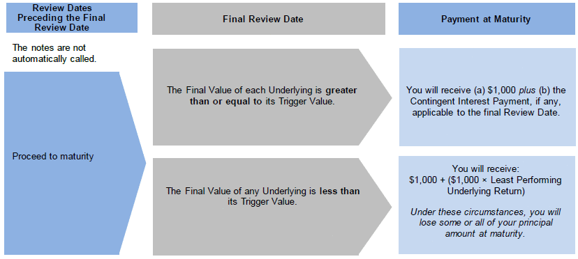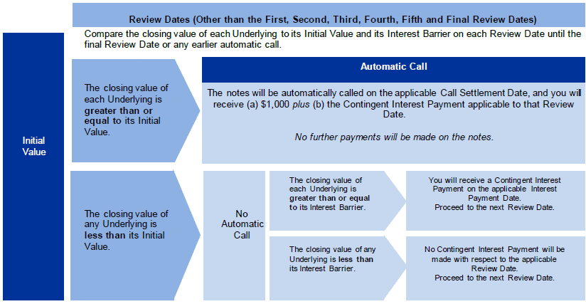 自动调用: 如果每份标的在任何审核日(第一、二、三、四、五和最后审核日除外)的期末价值大于或等于其初始价值,则票据将自动被要求支付现金,每张本金金额为1,000美元的票据,等于(a)1,000美元加上(b)适用于该审核日的或有利息付款,应在适用的赎回结算日支付。票据将不再支付。 到期付款: 如果票据未被自动赎回,且每份标的的最终价值大于或等于其触发值,您将在到期时收到现金付款,每张本金金额为1,000美元的票据,等于(a)1,000美元加上(b)适用于最终审查日期的或有利息付款(如有)。 如果票据未被自动赎回,且任何标的的最终价值低于其触发值,则每1,000美元本金票据的到期付款将按以下方式计算: $ 1,000 +($ 1,000 ×表现最差的基础回报) 如果票据未被自动赎回,且任何标的的最终价值低于其触发值,您将在到期时损失超过本金金额的50.00%,并可能在到期时损失全部本金金额。 表现最差的标的:表现最差的标的回报率 表现最差标的收益:标的收益最低 标的回报:就各标的而言, (终值–初值) 初始值:就每个标的而言,该标的在定价日的收盘价值 终值:就每只标的证券而言,该标的证券于最后审查日的收市价值 份额调整因子:对于每只基金,在确定该基金的期末价值时参考份额调整因子,并在定价日设置等于1.0。每只基金的份额调整系数在发生影响该基金的某些事件时进行调整。详见随附产品补充中的“标的–基金–反稀释调整”。 |