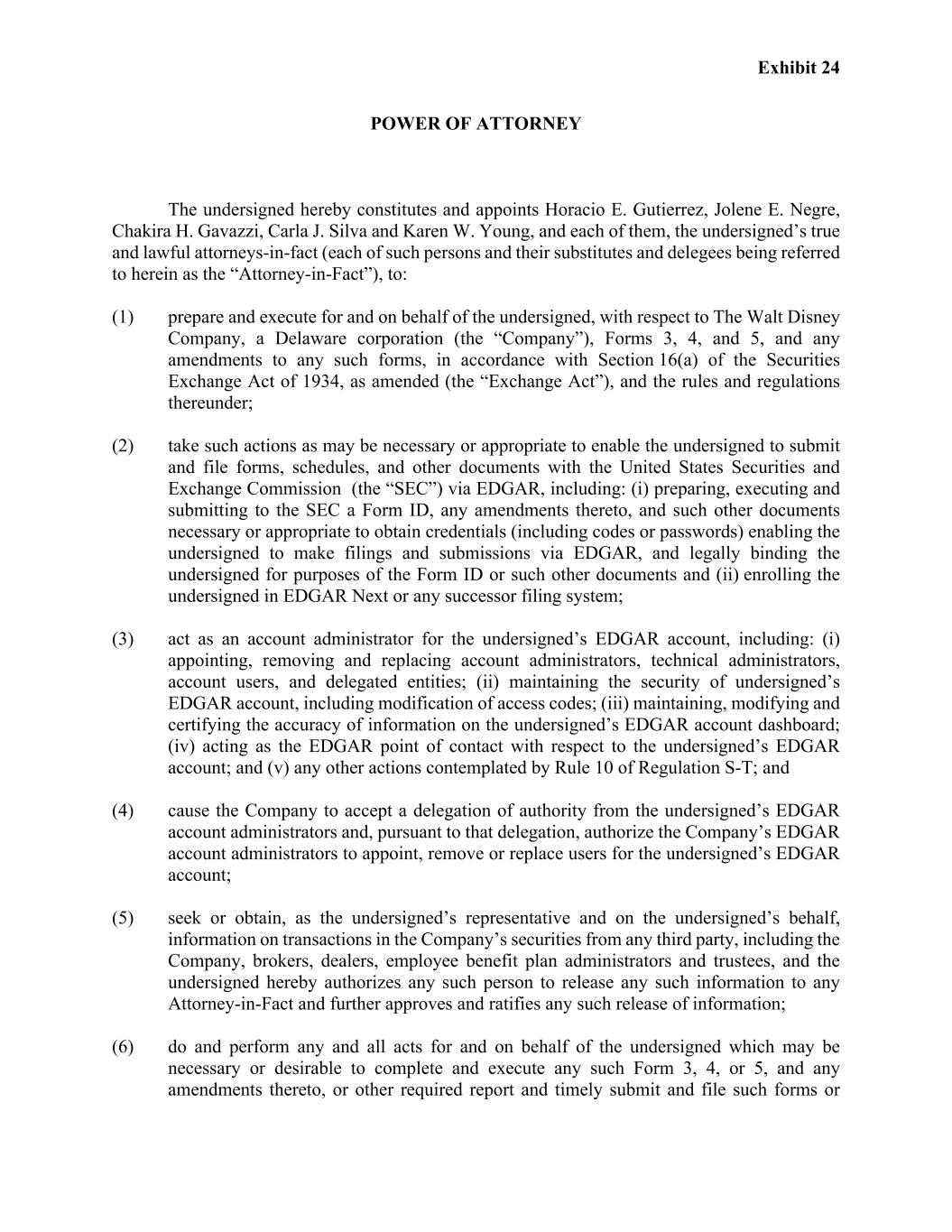 附件 24授权书以下签署人特此构成并任命Horacio E. Gutierrez、Jolene E. Negre、Chakira H. Gavazzi、Carla J. Silva和Karen W. Young,以及他们每一个人,以下签署人的真实和合法的事实上的律师(这些人及其替代人和受委托人在此被称为“事实上的律师”),以:(1)就特拉华州公司(“公司”)的事为并代表以下签署人准备和执行表格3、4和5,以及对任何此类表格的任何修订,根据经修订的《1934年证券交易法》(“交易法”)第16(a)节及其下的规则和条例;(2)采取可能必要或适当的行动,使以下签署人能够通过EDGAR向美国证券交易委员会(“SEC”)提交和归档表格、附表和其他文件,包括:(i)准备、执行并向SEC提交表格ID及其任何修订,以及获得凭据(包括代码或密码)所必需或适当的其他文件,使以下签署人能够通过EDGAR进行归档和提交,并就表格ID或此类其他文件而言对以下签署人具有法律约束力,以及(ii)在EDGAR Next或任何后续备案系统中注册以下签署人;(3)担任以下签署人的EDGAR账户的账户管理员,包括:(i)任命、解除和更换账户管理员、技术管理员、账户用户和受委托实体;(ii)维护以下签署人的EDGAR账户的安全性,包括修改访问代码;(iii)维护,修改和认证以下签名的EDGAR账户仪表板上的信息的准确性;(iv)就以下签名的EDGAR账户担任EDGAR联系点;(v)S-T条例第10条所设想的任何其他行动;(4)促使公司接受以下签名的EDGAR账户管理员的授权,并根据该授权授权公司的EDGAR账户管理员为以下签名的EDGAR账户指定、移除或替换用户;(5)作为以下签名的代表并代表以下签名的人寻求或获得,有关来自任何第三方(包括公司、经纪人、交易商、员工福利计划管理人和受托人)的公司证券交易的信息,以下签署人特此授权任何此类人员向任何实际律师发布任何此类信息,并进一步批准和批准任何此类信息发布;(6)为以下签署人和代表以下签署人执行任何和所有可能需要或可取的行为,以填写和执行任何此类表格3、4或5及其任何修订,或其他所需的报告,并及时提交和归档此类表格或