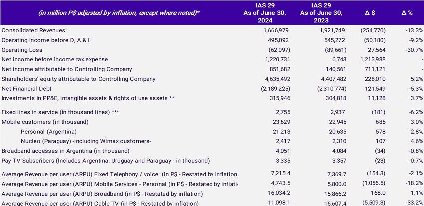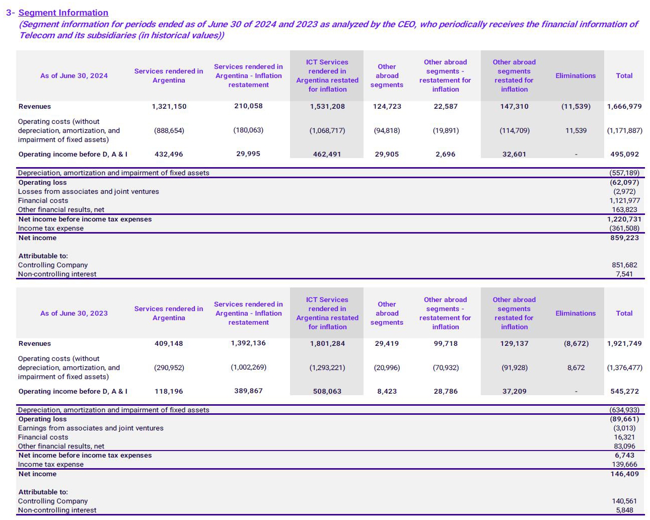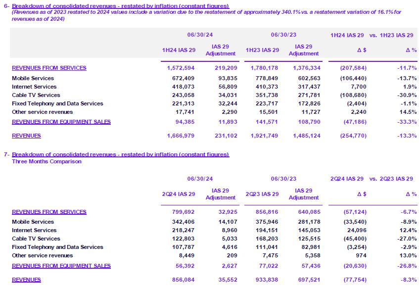 注:对于FFSS中包含的数字,公司考虑了国家价值委员会(“CNV”)第777/18号决议通过的通货膨胀调整的影响,该决议确定重述将适用于截至2018年12月31日(含)的年度财务报表、中期和特别期间。因此,对应于1H24的报告数字包括了根据IAS 29采用通货膨胀会计的影响。因此,本新闻稿中提到的与1H24和1H23之间结果差异相关的评论,对应的是“通胀重述的数字”或“不变”数字。此外,表3显示了截至2024年6月30日和2023年6月30日期间按分部细分的信息,由执行委员会和首席执行官分析,他们定期收到电信及其子公司的财务信息(以历史值计算)。详情请参阅第12页开始的财务表格标题。 |